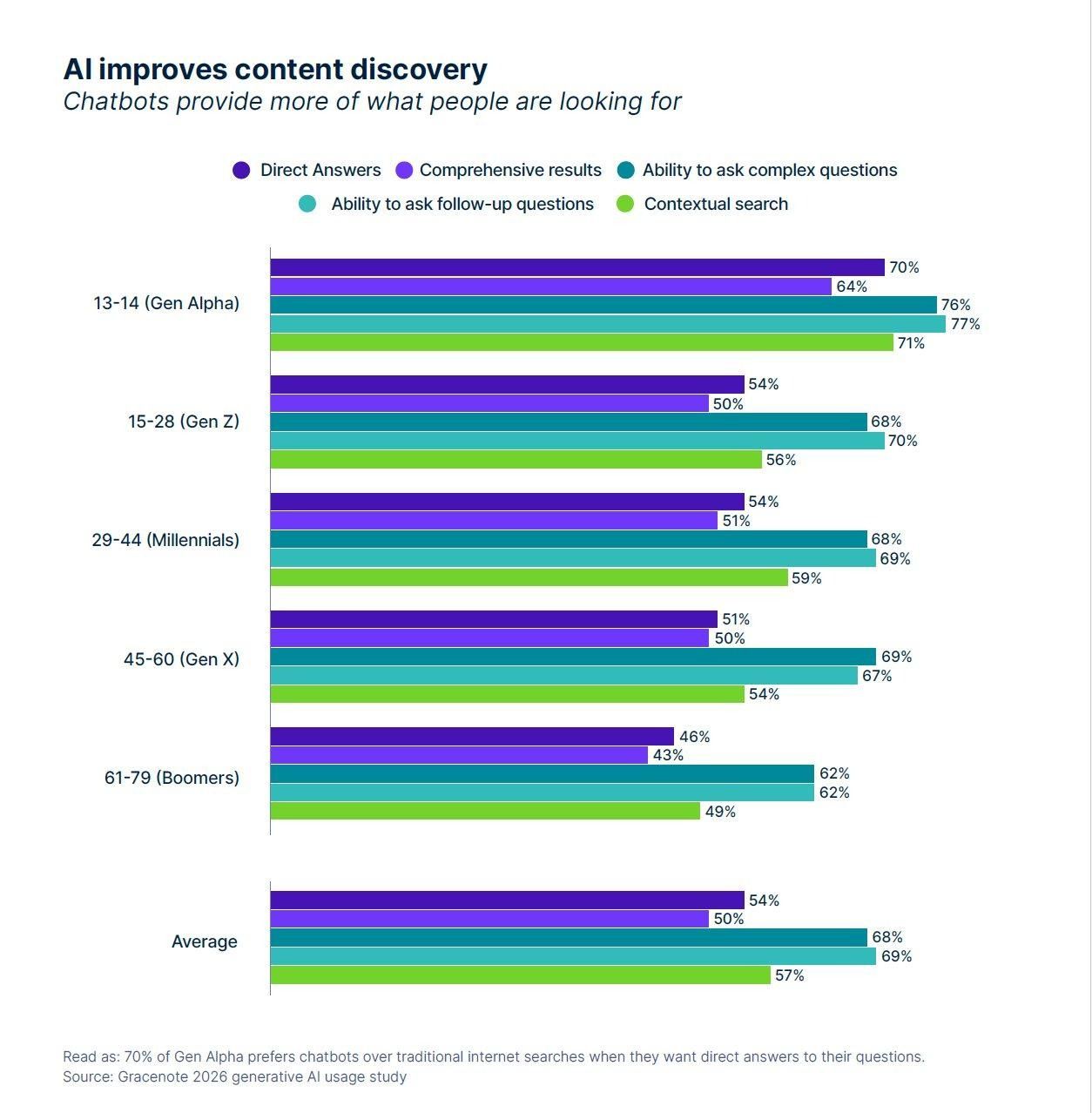 복잡한 질문(젠 알파 76%·평균 68%), 후속 질문(젠 알파 77%·평균 69%), 맥락 검색(젠 알파 71%·평균 57%)에서 AI 선호 압도적. 부머도 복잡한 질문·후속 질문에서 62%가 AI 선호. (출처: Gracenote 2026 GenAI Usage Study)