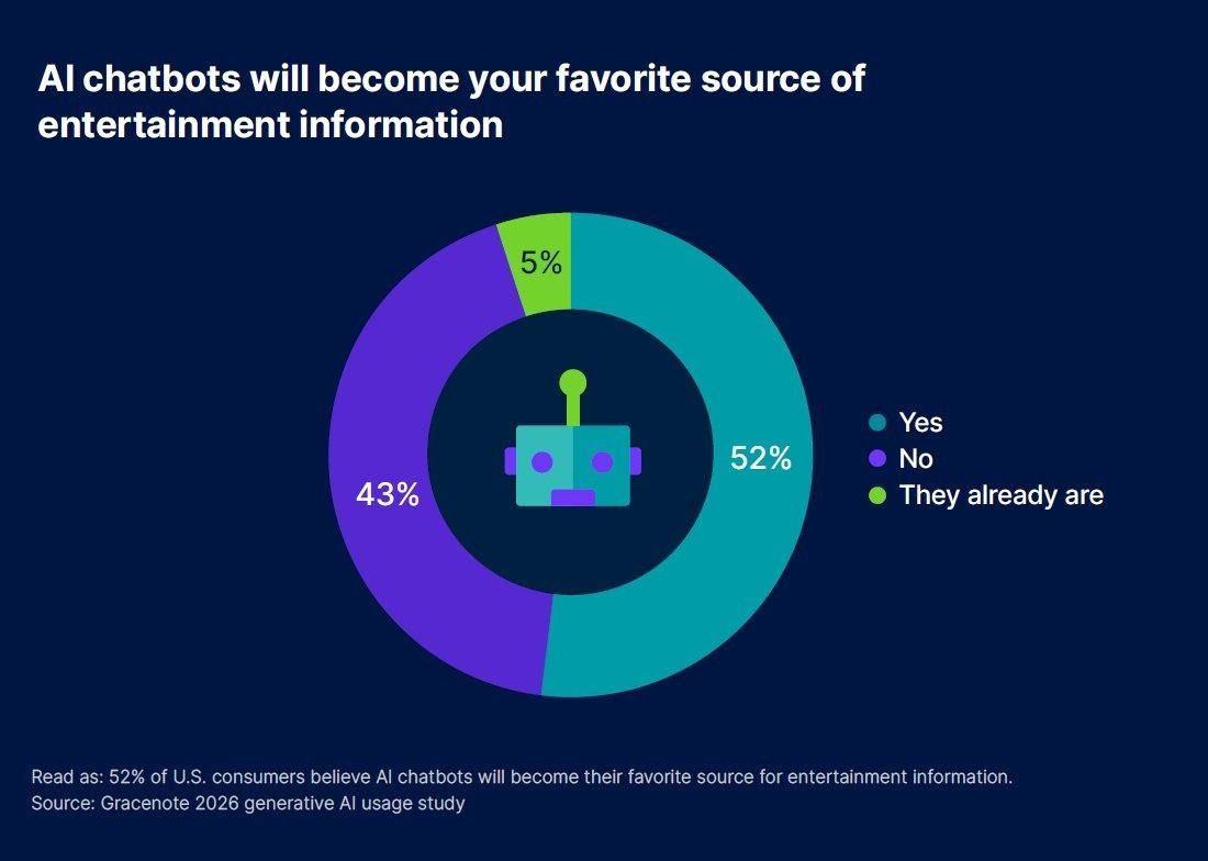 닐슨(Nielsen) 산하 메타데이터 기업 그레이스노트(Gracenote)가 2026년 초 발표한 생성AI 이용실태 조사(2026 Generative AI Usage Study)는 이 위기의 출구를 데이터로 보여준다. 미국 소비자 4,000명 이상을 대상으로 한 이 조사에서 시청자들은 이미 AI 챗봇을 리모컨 대신 집어 들기 시작했다. 미국 소비자의 52%는 AI 챗봇이 향후 엔터테인먼트 정보의 가장 선호되는 수단이 될 것이라 예상했고, 젠 알파(Gen Alpha·2010~2024년생)의 88%는 AI가 좋은 엔터테인먼트 경험 제공에 중요하다고 응답했다.