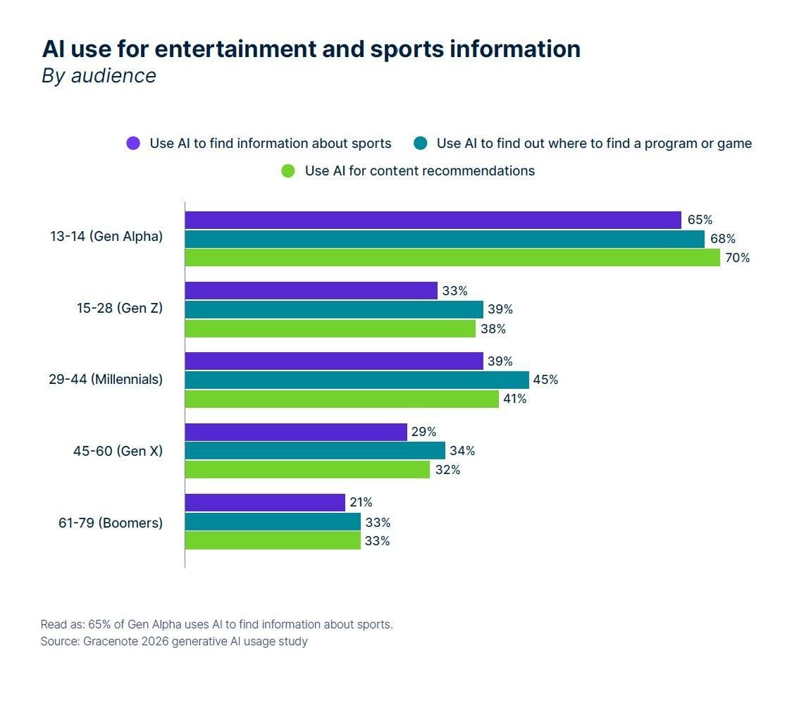 젠 알파는 스포츠 정보 탐색(65%), 시청 가능 채널 찾기(68%), 콘텐츠 추천(70%) 모두 AI 의존. 밀레니얼의 채널 찾기(45%)는 전 연령대 최고. (출처: Gracenote 2026 GenAI Usage Study)