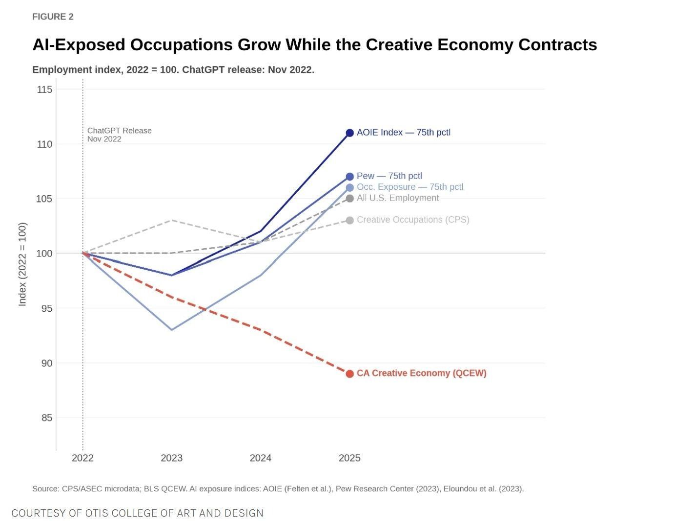 A new report from Los Angeles-based Otis College of Art and Design, released April 7, demolishes that narrative with data. The occupations most exposed to AI — writers, software developers, artists — actually grew during this period. The sectors that contracted most were film, television, and traditional media, gutted not by algorithms but by the collapse of Peak TV and the pivot to streaming profitability.