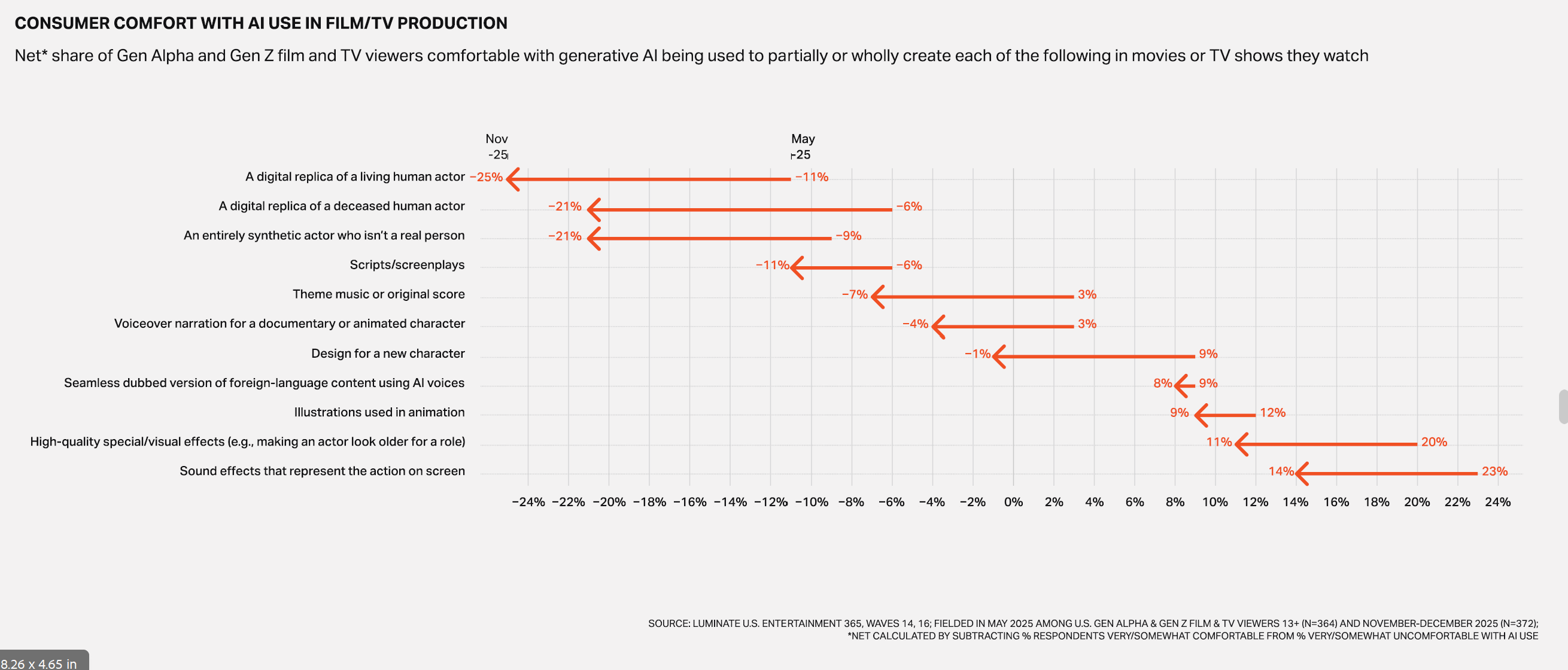 California's creative economy lost 114,000 jobs between 2022 and 2025 — a 14 percent decline. The film, TV, and sound sector contracted by nearly 30 percent; traditional media fell by approximately 34 percent. On the surface, these losses coincide with the ChatGPT release in November 2022. But the report's authors argue the pattern of losses does not match an AI displacement scenario.
