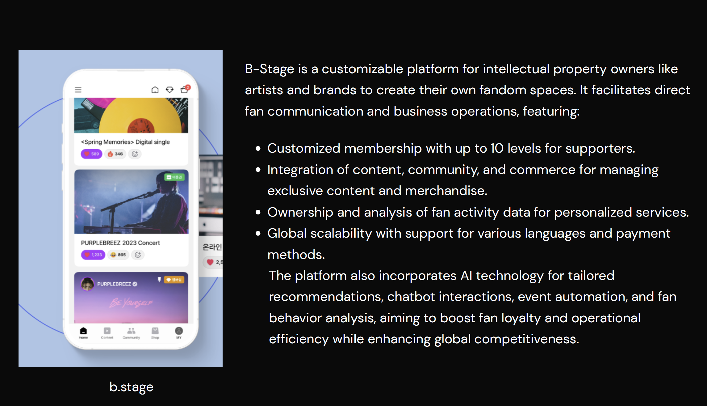 B-Stage는 아티스트와 브랜드가 독립적인 팬덤 공간을 만들 수 있는 화이트라벨 플랫폼이다. 최대 10단계 멤버십, AI 챗봇, 이벤트 자동화, 팬 행동 분석 등을 통해 IP 소유자가 데이터와 커뮤니티를 직접 운영할 수 있도록 지원한다.