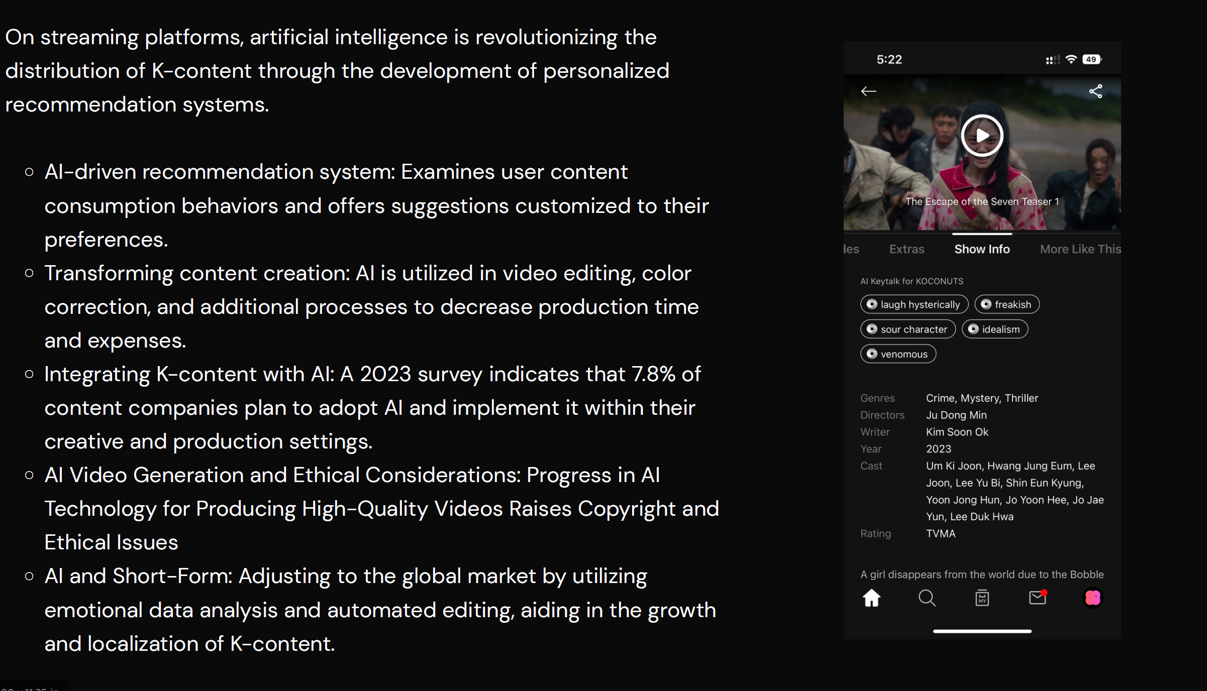 Kocowa's AI-based services don't stop there. The platform analyzes users' viewing history and preferences to recommend personalized content and provides an ad-free viewing experience within 24 hours, enhancing satisfaction among global fans.