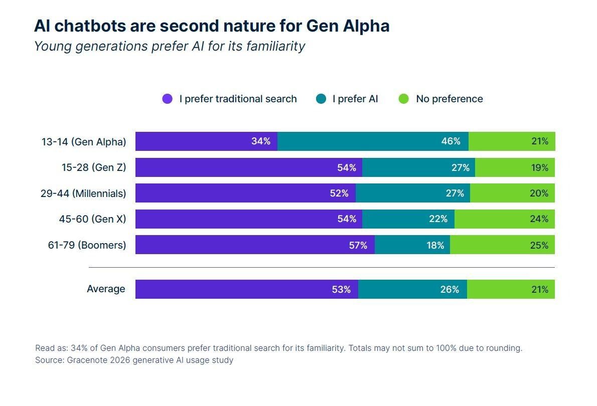 Gen Alpha (ages 13–14) has already flipped the preference: 46% prefer AI vs. 34% for traditional search. Overall average remains traditional search 53% vs. AI 26% — but the trajectory is clear. Source: Gracenote 2026 GenAI Usage Study