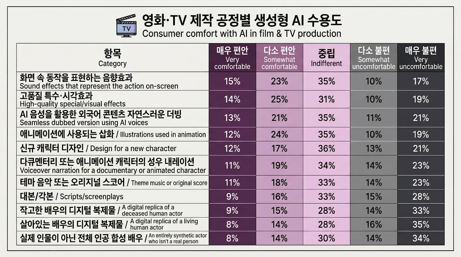 그러나 창작의 중심부와 '사람의 얼굴'이 걸려 있는 영역으로 들어가면 분위기가 급변한다. 시나리오 작성에 AI가 개입하는 데 대해서는 편안함 25% vs 불편함 43%로, 불편 응답이 크게 앞선다. 고인이 된 배우의 디지털 복제는 편안함 24% vs 불편함 47%, 생존 배우의 디지털 복제는 편안함 22% vs 불편함 51%로 과반이 명시적으로 불편함을 표했다. 완전히 합성된 가상 배우에 대한 거부감 역시 48% 수준으로 나타났다.