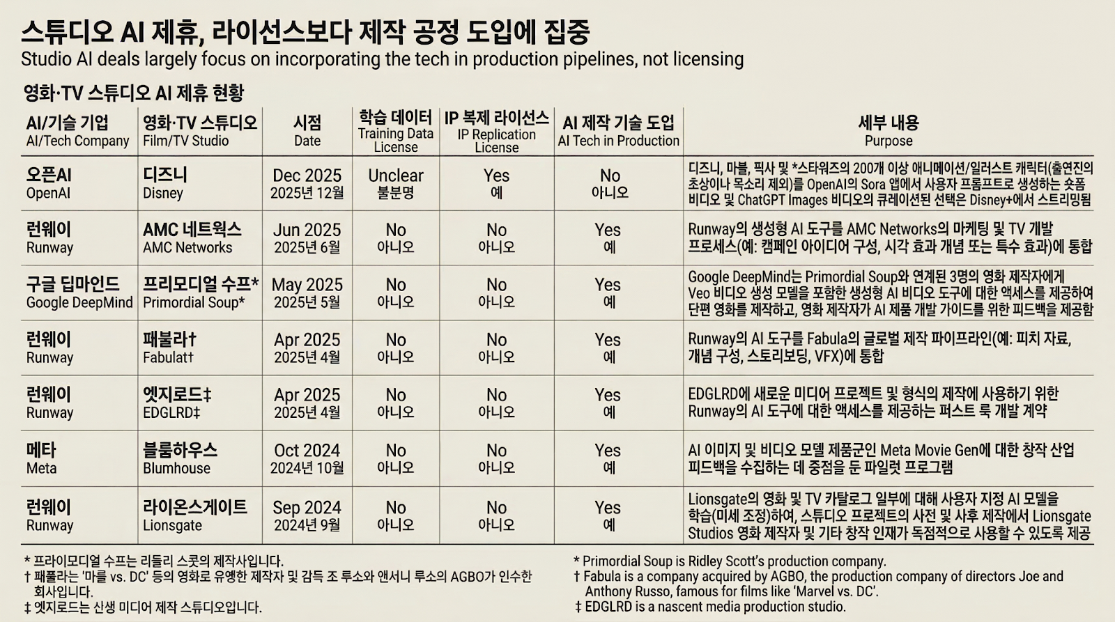 따라서 2026년 현재 스튜디오 AI 딜을 관통하는 키워드는 데이터 캐시를 통째로 파는 '라이선싱'이 아니라, 제작·전송·개인화 전 과정에 AI를 직접 심어 넣는 '파이프라인' 구축이다.