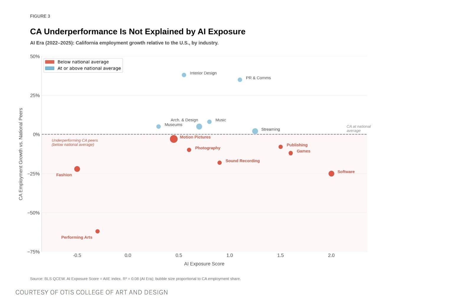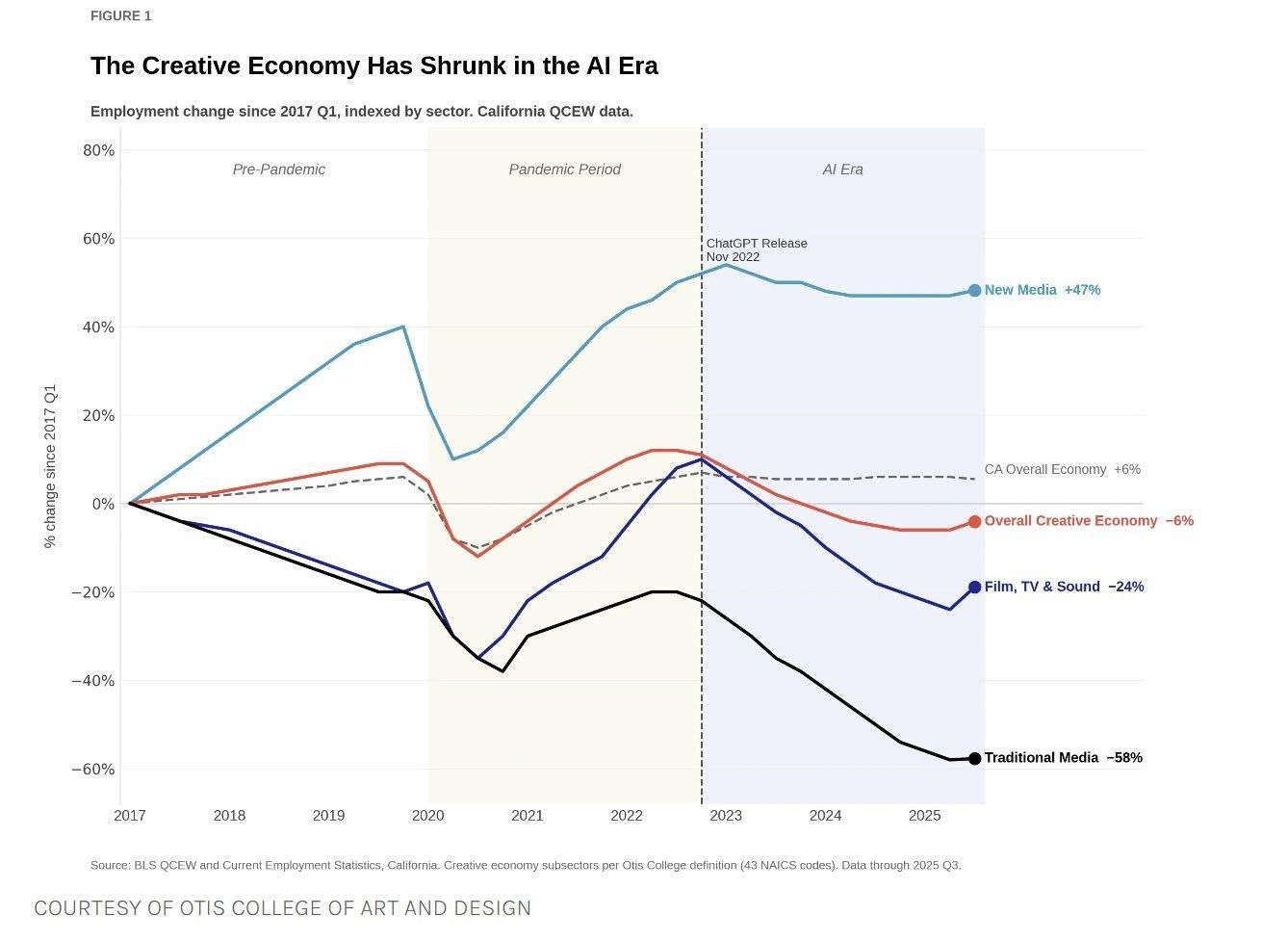 2022~2025년 캘리포니아 크리에이티브 이코노미는 총 11만 4,000개 일자리(전체의 14%)를 잃었다. 표면적으로는 ChatGPT 출시(2022년 11월) 이후 시기와 맞물리지만, 보고서는 손실의 패턴이 AI 대체 시나리오와 일치하지 않는다고 분석했다.