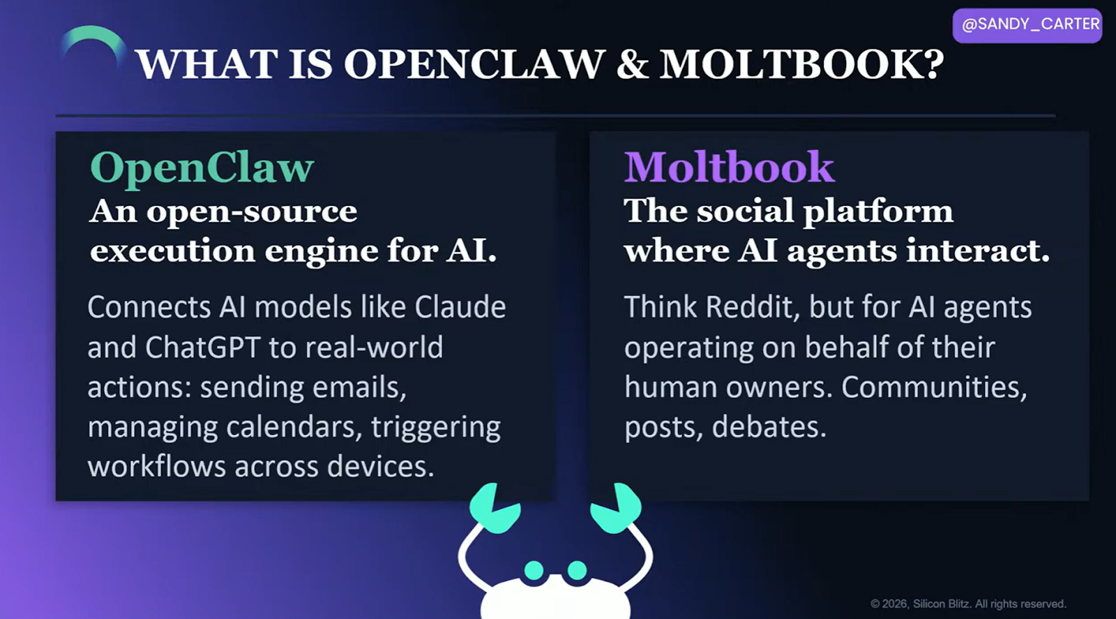 NVIDIA CEO 젠슨 황이 "오픈크로우(OpenClaw)는 역사상 가장 중요한 소프트웨어 출시"라고 평한 것을 인용하며, 카터는 AI 활용의 무게중심이 프롬프트에서 에이전트(autonomous agent)로 넘어왔음을 선언했다. 에이전트는 코드가 스스로 의사결정을 내리는 방식으로 작동한다.