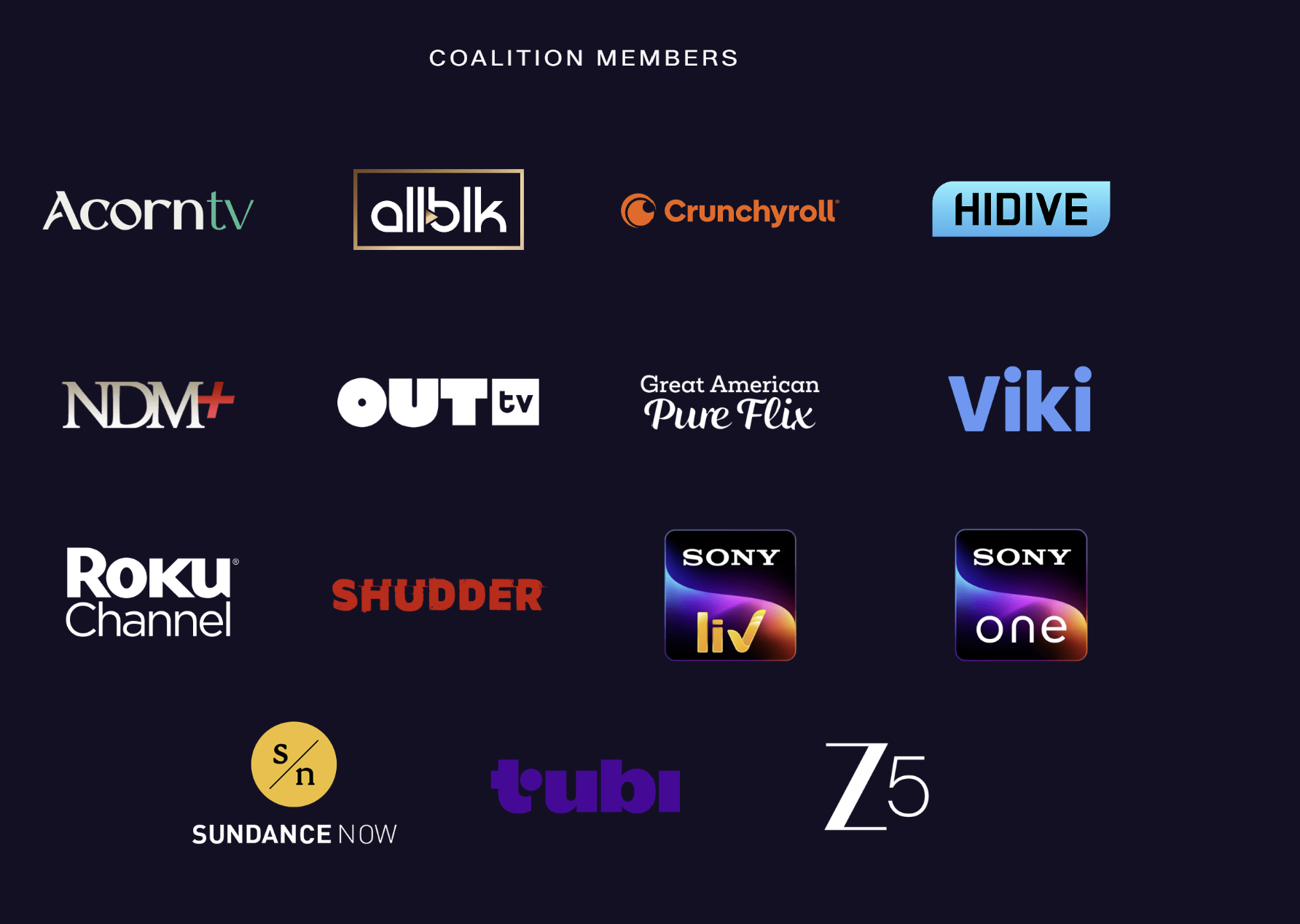 이번 연합에는 일본 애니메이션의 글로벌 유통을 견인하는 크런치롤(Crunchyroll), 월간 활성 이용자 1억 명 규모의 무료 광고 기반 스트리밍 TV FAST 투비(Tubi), 특화 콘텐츠와 엔터테인먼트 테크의 상징 로쿠(Roku) 채널 등은 물론, 영국 드라마 전문 아르콘TV(Acorn TV), 흑인 콘텐츠 중심 ALLBLK, 호러 특화 슈레더(Shudder,0 독립 영화 플랫폼 선댄스 나우(Sundance Now,) 인도·필리핀·아시아 시장의 소니리브(SonyLiv),지5(Zee5), NDM+, K-콘텐츠·아시아 드라마 글로벌 유통 거점 라쿠텐 비키(Rakuten Viki) 등 각 대륙과 장르별 대표적인 스트리밍 서비스들이 대거 참여하고 있다.