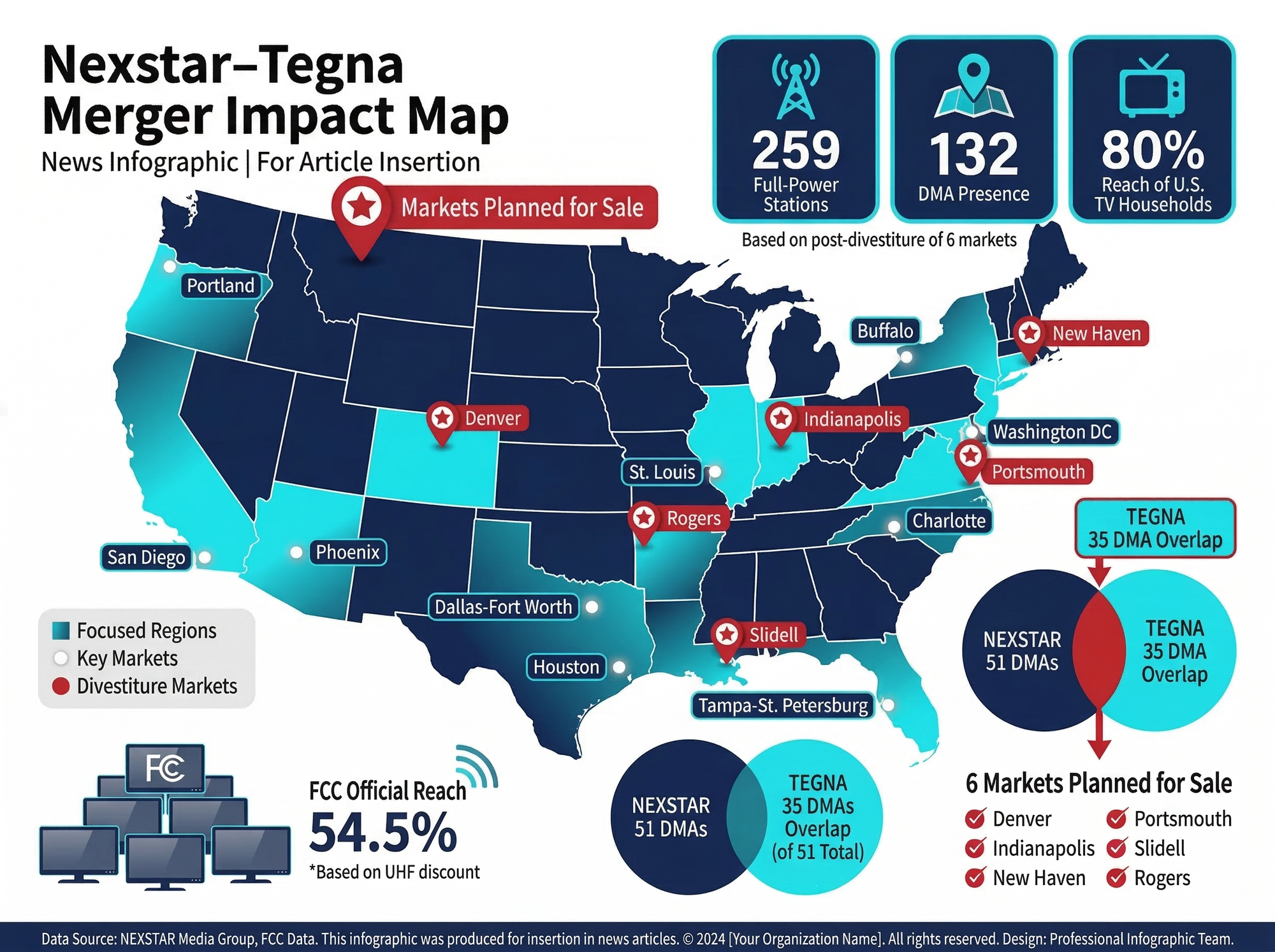 The combined entity spans 265 TV stations across 44 states and Washington D.C., reaching approximately 80% of US television households. With $8.1 billion in annual revenue and affiliates across all four major networks — ABC, CBS, FOX, and NBC — Nexstar becomes a single super-group with unprecedented reach in US local television. The political dimension was explicit: President Trump posted 'Get that deal done!' on social media in February, framing the merger as a check on 'fake news networks.' FCC Chair Brendan Carr responded publicly: 'Let's get it done.' The spectacle of a regulatory chief publicly endorsing a specific private transaction in response to a presidential post was unprecedented.