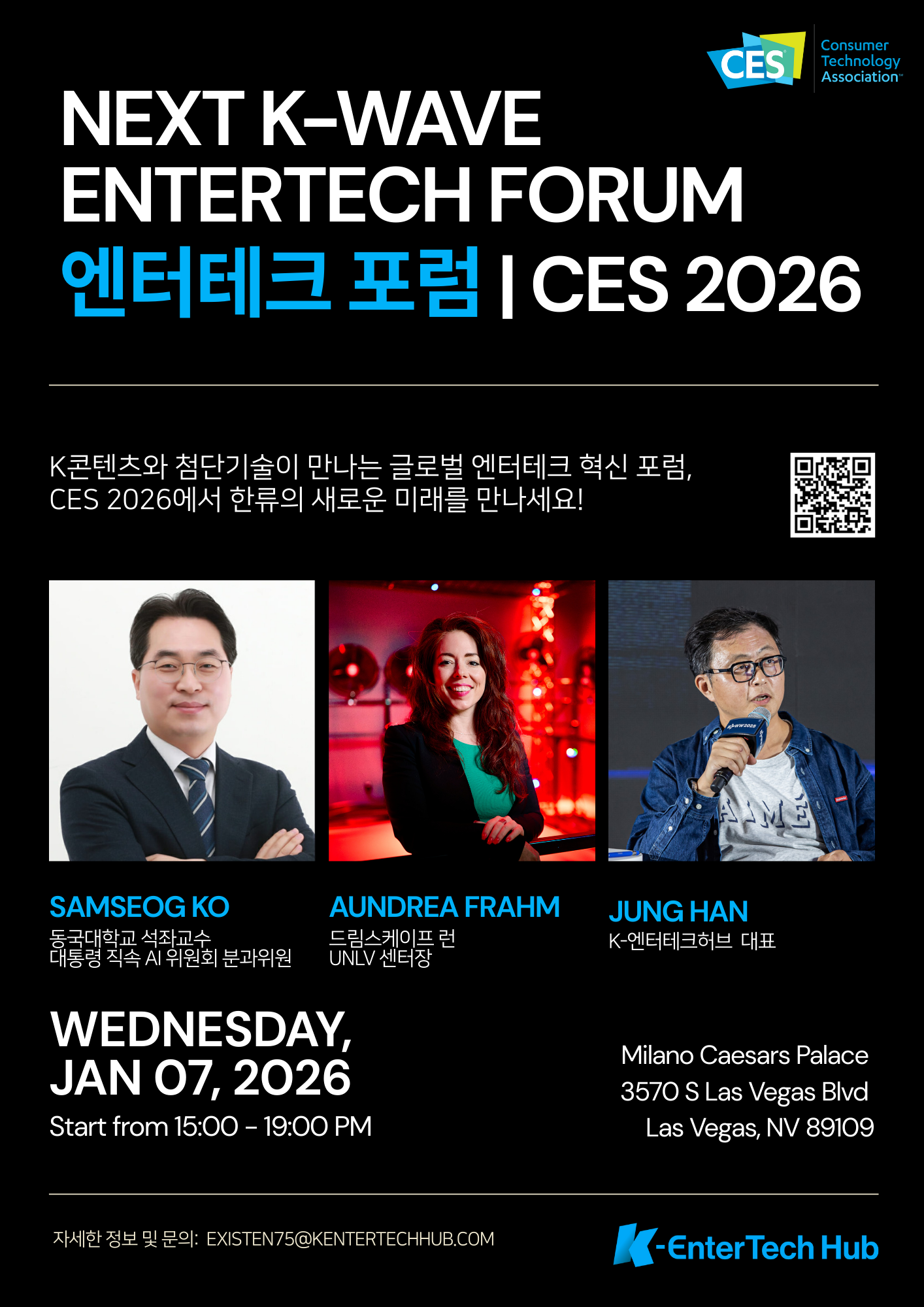 한편, CES 2026을 앞두고 K-엔터테크허브(K-EnterTech Hub, www.kentertechhub.com)는 2025년 12월 4일 오후 5시(한국시간) CES 1차 엔터테크 트렌드 웨비나를 개최한다. CES와 엔터테크에 관심 있는 누구나 참여 가능하며, QR코드를 통해 신청할 수 있다.
