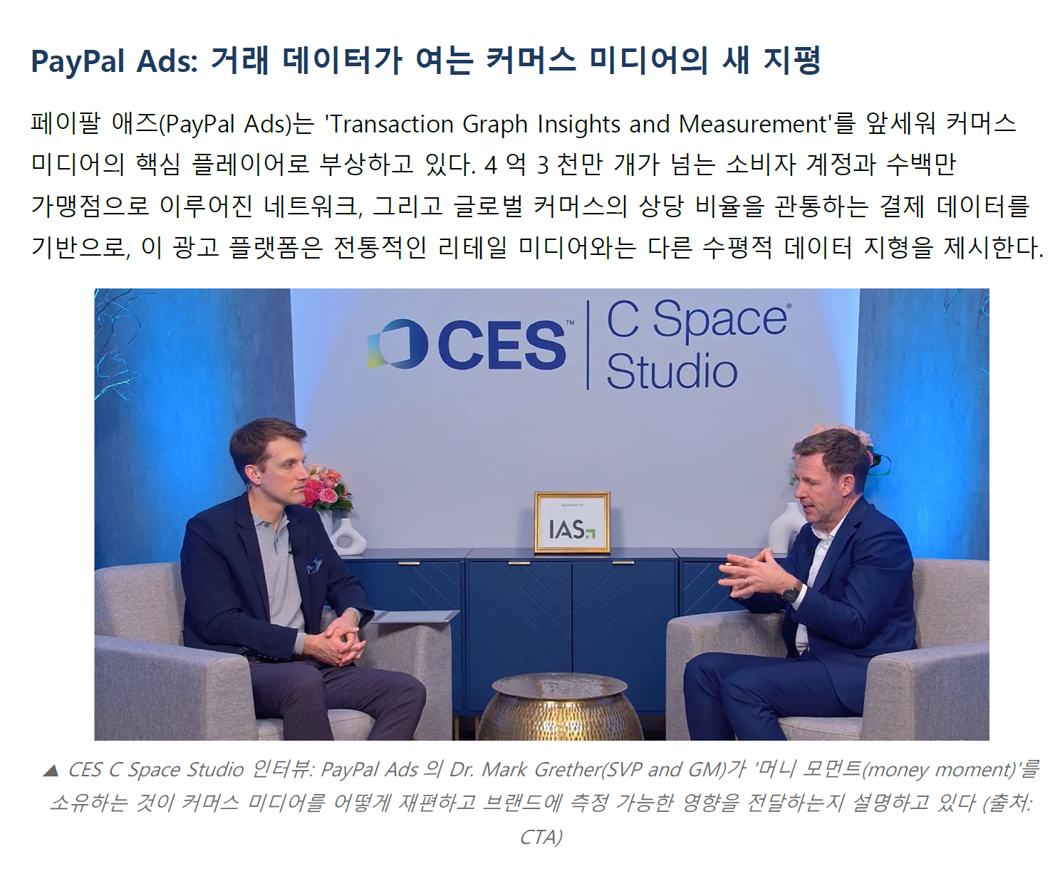 PayPal Ads๋ 4์ต 3์ฒ๋ง ๊ฐ ์๋น์ ๊ณ์ ๊ณผ ์๋ฐฑ๋ง ๊ฐ๋งน์ ๋คํธ์ํฌ๋ฅผ ๊ธฐ๋ฐ์ผ๋ก ๊ฑฐ๋ ๋ฐ์ดํฐ ์ค์ฌ์ ์ปค๋จธ์ค ๋ฏธ๋์ด ๋ชจ๋ธ์ ์ ์ํ๋ค. ๋จ์ผ ๋ฆฌํ ์ผ๋ฌ์ ๊ฐํ ํ์ํ ๋ฆฌํ ์ผ ๋ฏธ๋์ด๊ฐ ์๋, ๊ฒฐ์ ๊ฐ ์ผ์ด๋๋ ๋ชจ๋ ์ ์ ์ผ๋ก ํ์ฅ๋๋ '์ํํ ์ปค๋จธ์ค ๋ฏธ๋์ด ๋คํธ์ํฌ'์ ๋ฑ์ฅ์ด๋ค.
