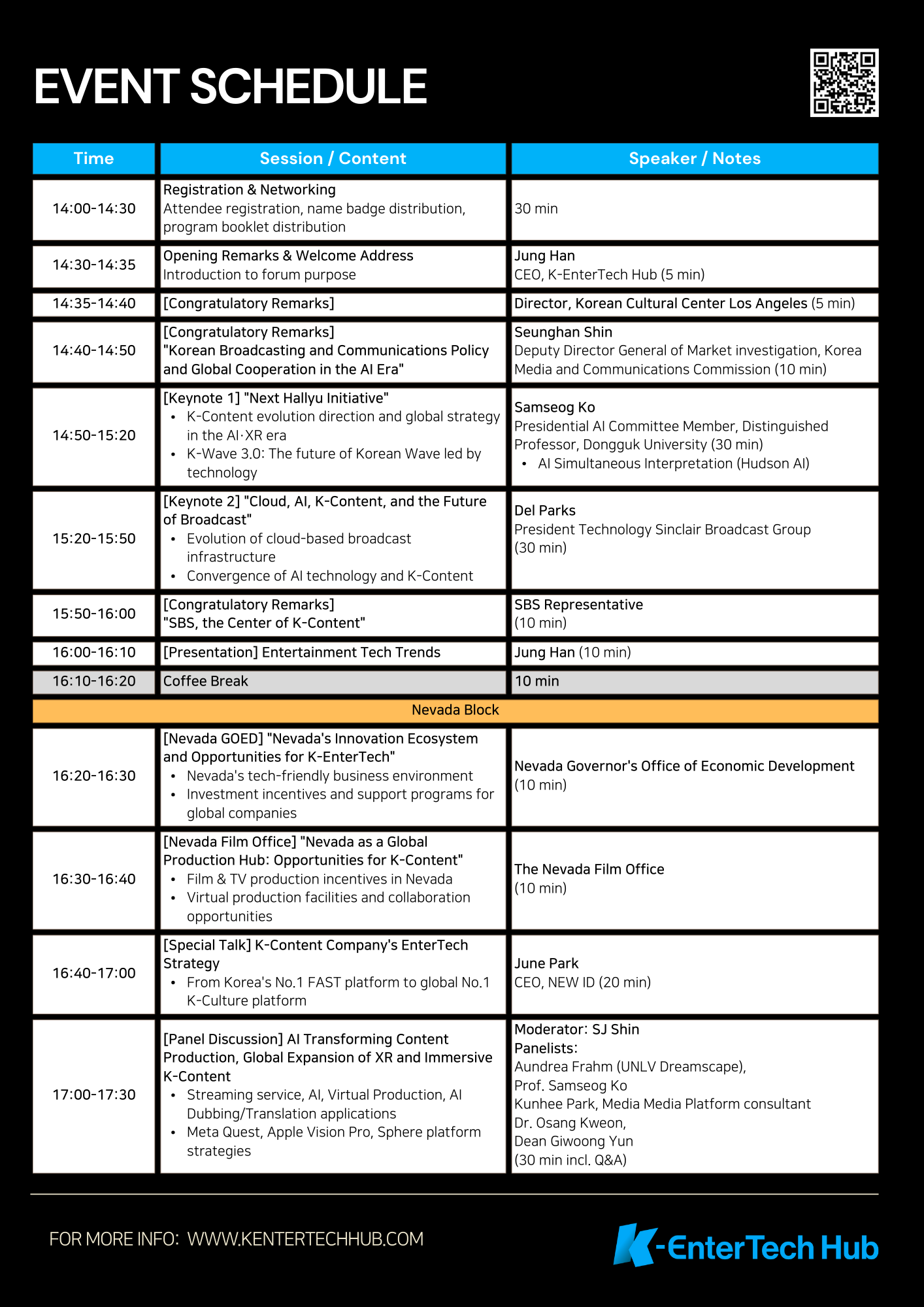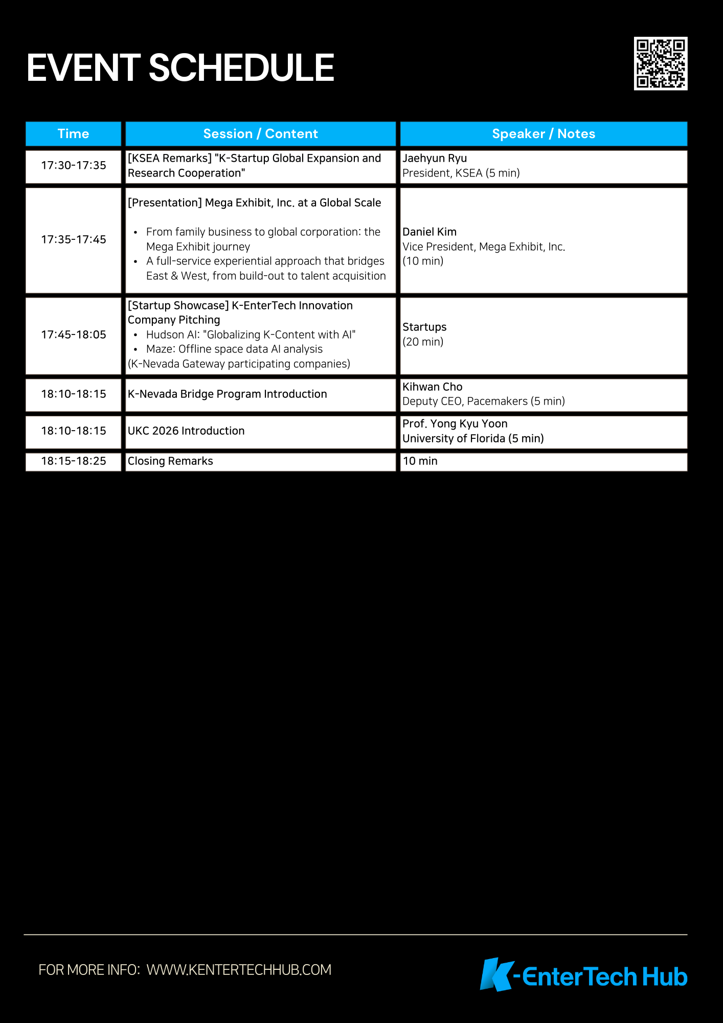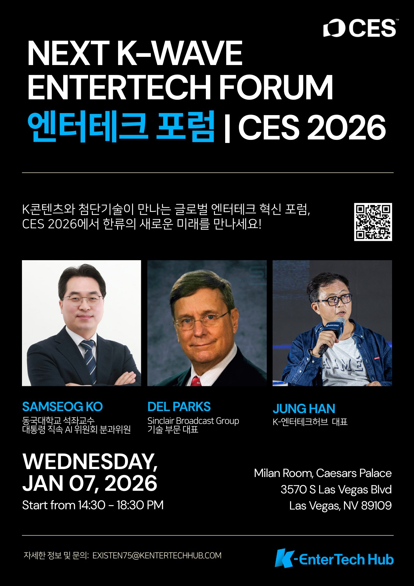 1월 7일 K엔터테크허브는 네바다경제청(GOED), 코코와(Kocowa), 메가 익스히비션(Mega Exhibition) 등과 함께 엔터테인먼트 테크 시대 K웨이브와 AI엔터테인먼트의 미래를 논의하는 ‘넥스트 K웨이브 엔터테크@CES2026’ 포럼을 시저스 팰리스 밀란룸(Milan room)에서 오후 2시 30분부터 개최한다. (주소 Caesars Palace – Milano Ballroom (Milan Room) 3570 S Las Vegas Blvd, Las Vegas, NV 89109, United States)