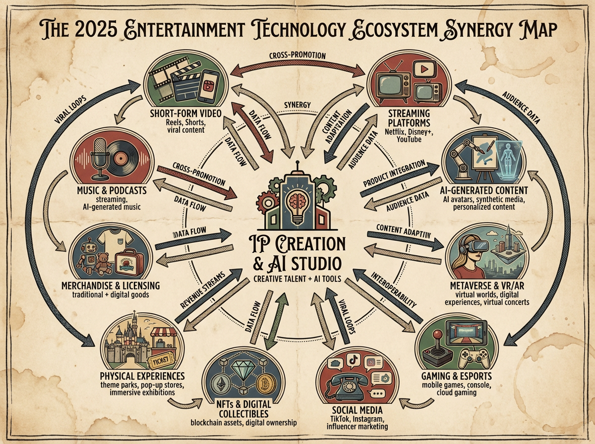 1957년 월트 디즈니의 전설적인 시너지 맵을 현대 엔터테크 생태계로 재해석한 다이어그램입니다.