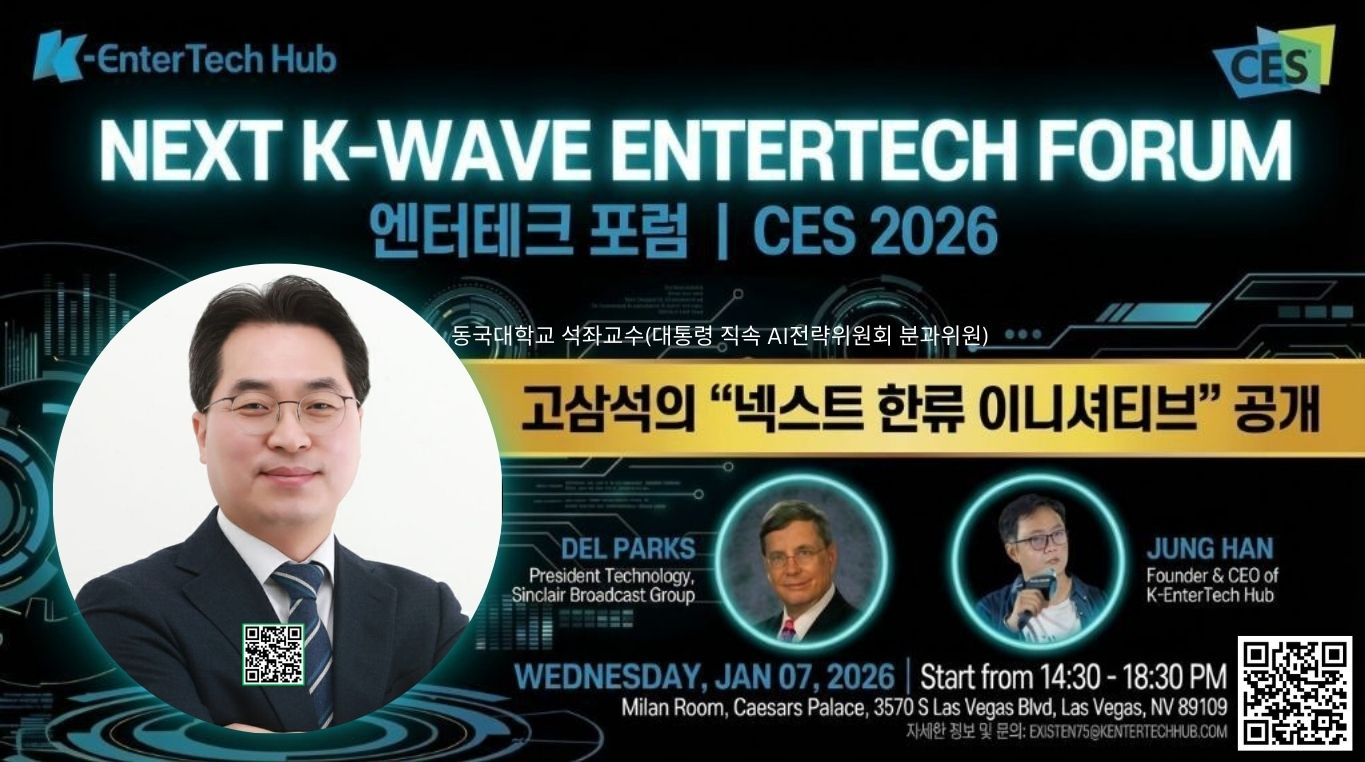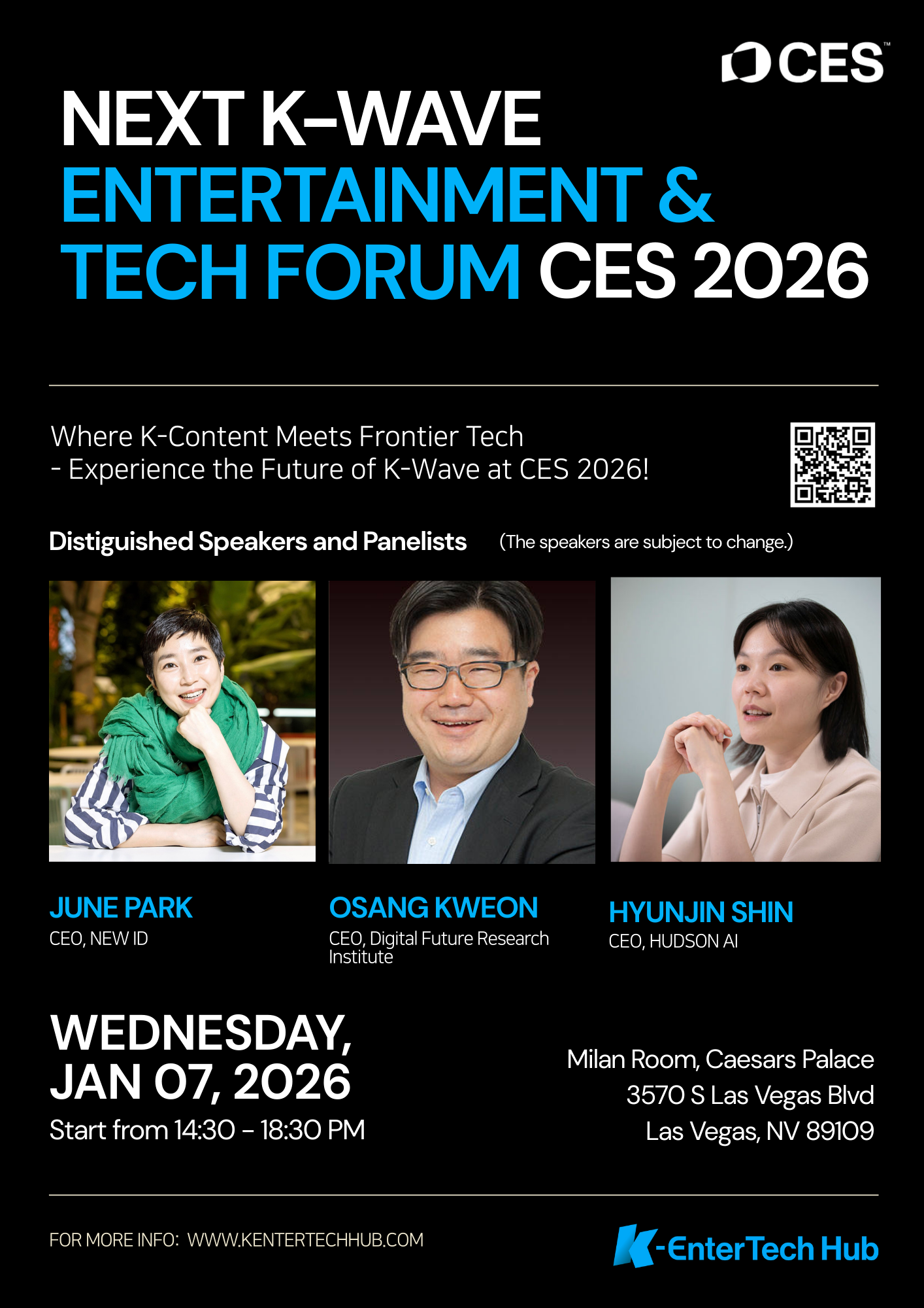 이러한 글로벌 엔터테인먼트 지형 변화 속에서 K-EnterTechHub는 2026년 1월 7일 CES 2026 기간 중 라스베이거스 시저스 팰리스(Caesars Palace) 밀란룸에서 '넥스트 K웨이브 엔터테크@CES2026(NEXT K-WAVE EnterTech@CES2026)' 포럼을 개최한다.