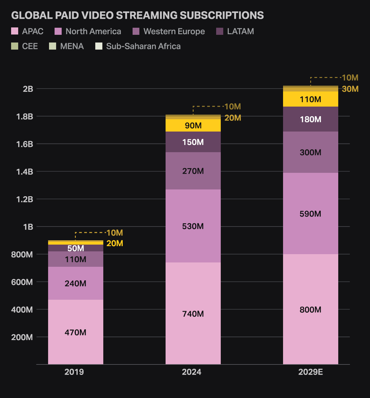 루미네이트 인텔리전스의 2025년 12월 보고서는 미국 SVOD 시장이 2019~2024년 사이 두 배로 성장한 이후, 향후 5년간 성장률이 11% 수준에 그칠 것이라고 전망하며 ‘양적 성장의 시대’가 저물고 있음을 지적한다.