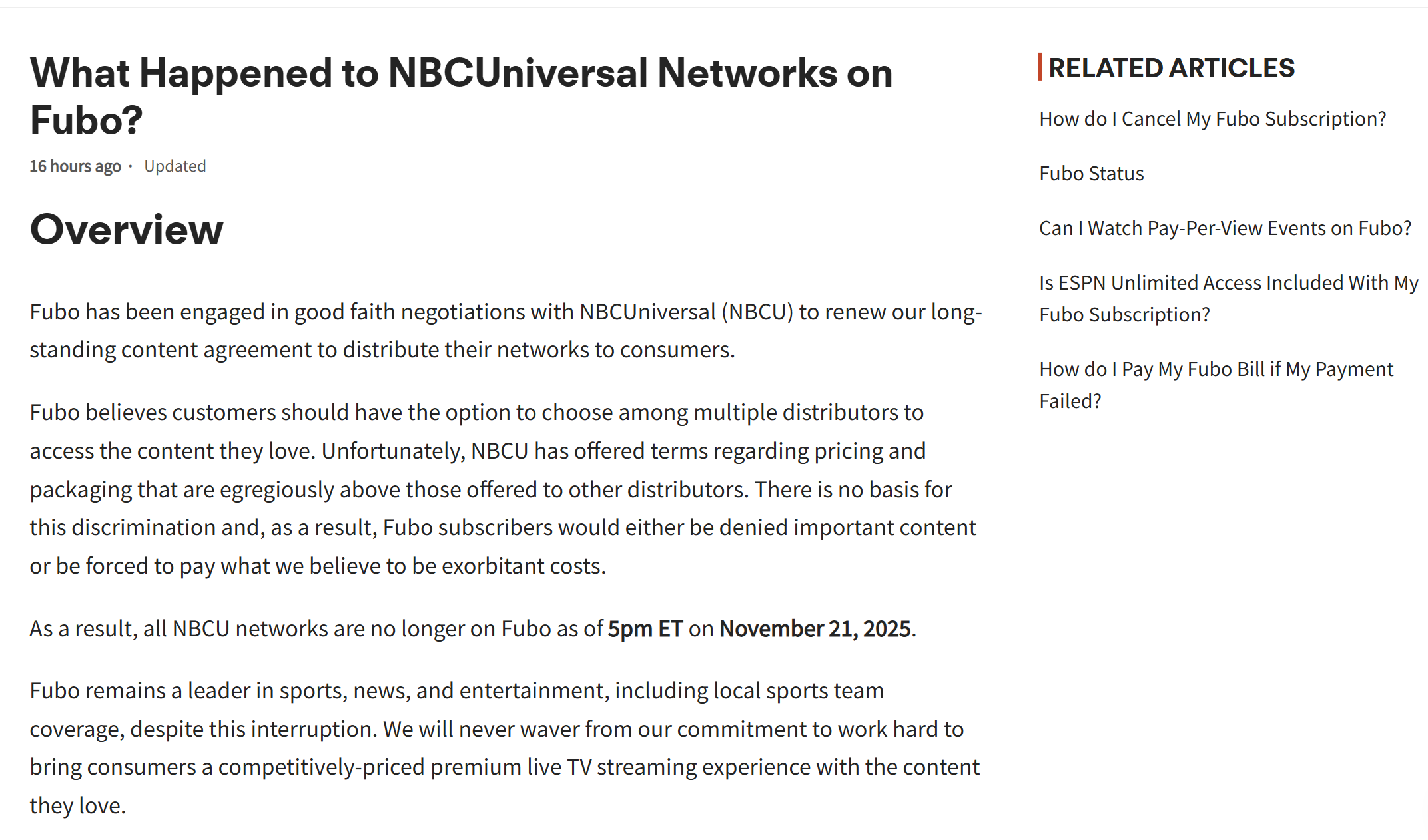 미국 동부시간 2024년 11월 21일 오후 5시, 디즈니(Disney) 산하 가상 다채널 영상 프로그램 배급사업자(vMVPD, virtual Multichannel Video Programming Distributor)인 푸보(Fubo)에서 NBC유니버설(NBCUniversal, 이하 NBCU) 계열 전 채널에 대한 블랙아웃(Blackout)이 발생했다.