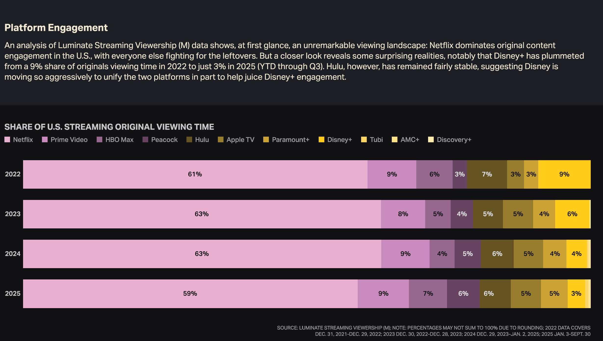 Disney+ is sounding the alarm. According to data analytics firm Luminate, Disney+'s share of original content viewing time in the U.S. has plummeted from 9% in 2022 to just 3% in 2025 (YTD)—the steepest decline among major paid platforms. Original series viewing time has nearly halved from 44.3 billion minutes in 2022 to 20.2 billion minutes in 2025.