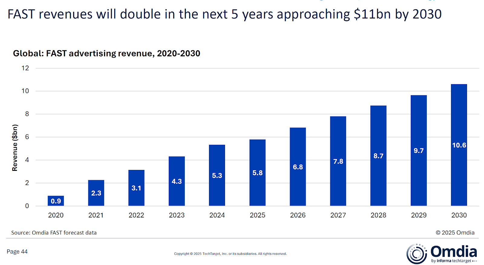 FAST refers to streaming services that offer free content in exchange for watching advertisements. According to research firm Omdia, the global FAST market is projected to more than double from $8 billion in 2023 to $18 billion by 2028. In the United States, FAST already accounts for approximately 15% of total streaming viewership.
