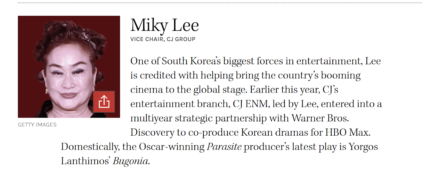 Miky Lee, Vice Chair of CJ Group, was recognized for bringing Korean cinema to the global stage. This year, CJ ENM entered a strategic partnership with Warner Bros. Discovery to co-produce Korean dramas for HBO Max.