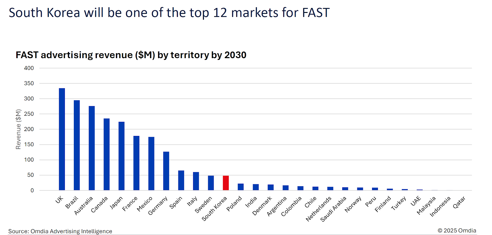 Omdia indicates that while leading markets like the UK, Brazil, Australia, Canada, Japan, and France will dominate FAST advertising revenue in 2030, South Korea is projected to achieve significant revenue within the mid-tier group alongside Italy and Sweden.