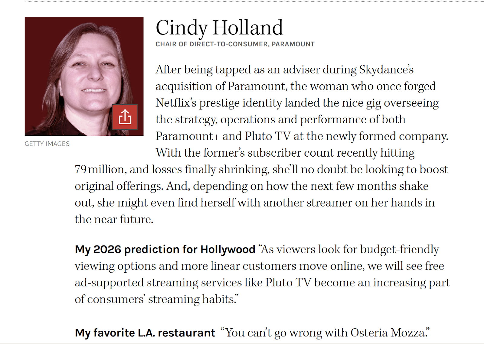 Cindy Holland, who designed Netflix's early premium content strategy, now oversees Paramount+ and Pluto TV at Paramount. Pluto TV has surpassed 80 million monthly active users as a leading FAST platform.