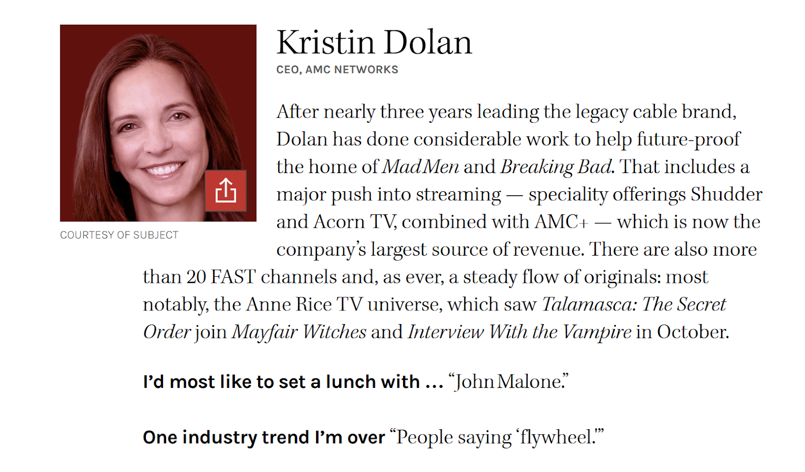 Kristin Dolan, CEO of legacy cable brand AMC Networks, operates more than 20 FAST channels as part of the company's digital transformation. The streaming division—combining specialty services Shudder, Acorn TV, and AMC+—has become the company's largest revenue source.