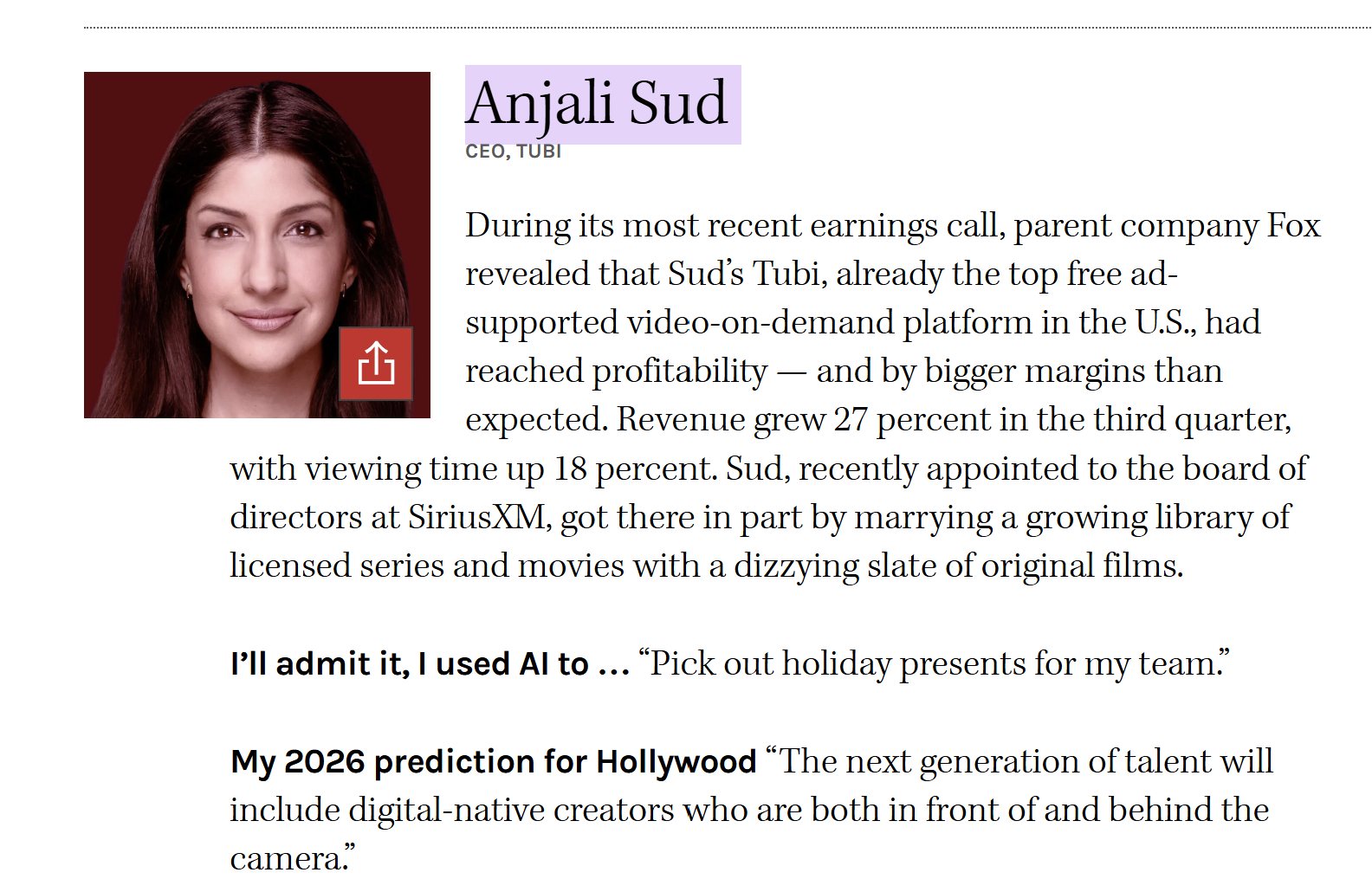 Anjali Sud, CEO of Tubi, America's leading FAST platform, made the list. According to parent company Fox, Tubi recently achieved profitability, with Q3 revenue growing 27% year-over-year and viewing time increasing 18%. Sud drove these results by combining licensed content with original films.