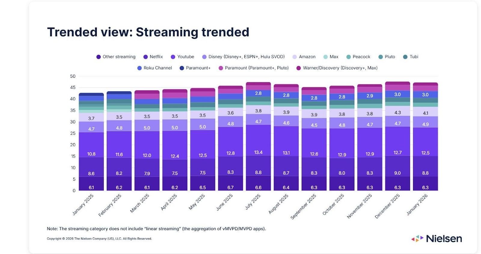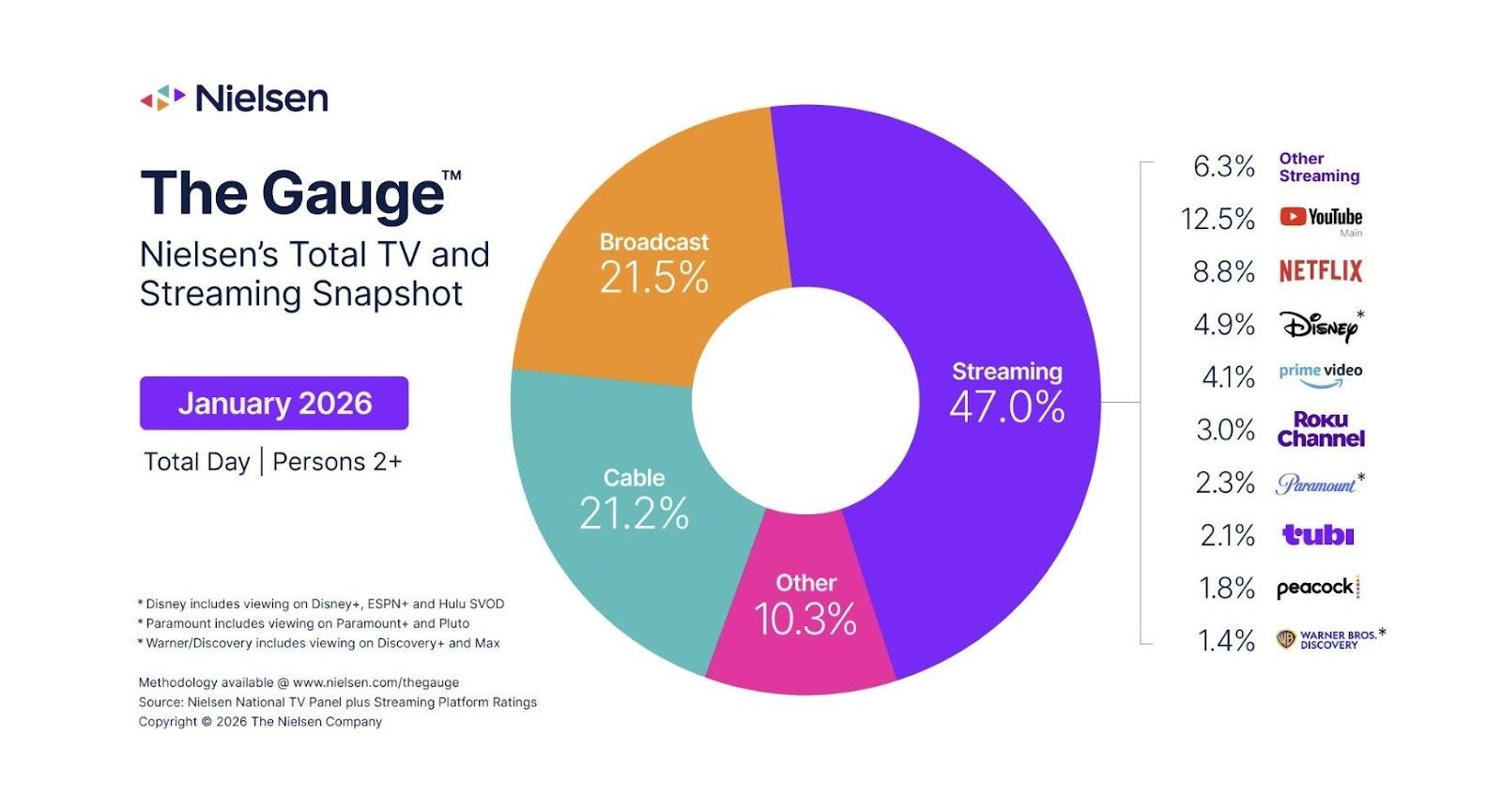 이 기사는 Nielsen The Gauge™ 및 Nielsen Trended View 2026년 1월 보고서(발표: 2026년 2월 17일)를 기반으로 K-EnterTechHub가 한국 콘텐츠 및 미디어 테크 산업 관점에서 분석·재해석한 것입니다.