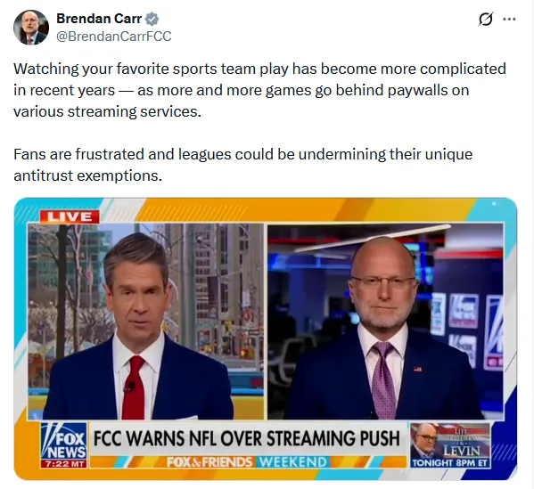 글로벌 스포츠 중계권 시장이 빅테크 스트리밍 중심으로 재편되는 가운데, 미국 FCC가 마침내 칼을 뽑았다. 브렌던 카(Brendan Carr) 위원장은 폭스뉴스 생방송에서 NFL을 향해 “지나친 스트리밍 쏠림이 계속될 경우, 1961년 스포츠방송법(SBA)으로 보장된 독점금지법 면제 특권을 더 이상 인정하기 어렵다”고 공개 경고했다.