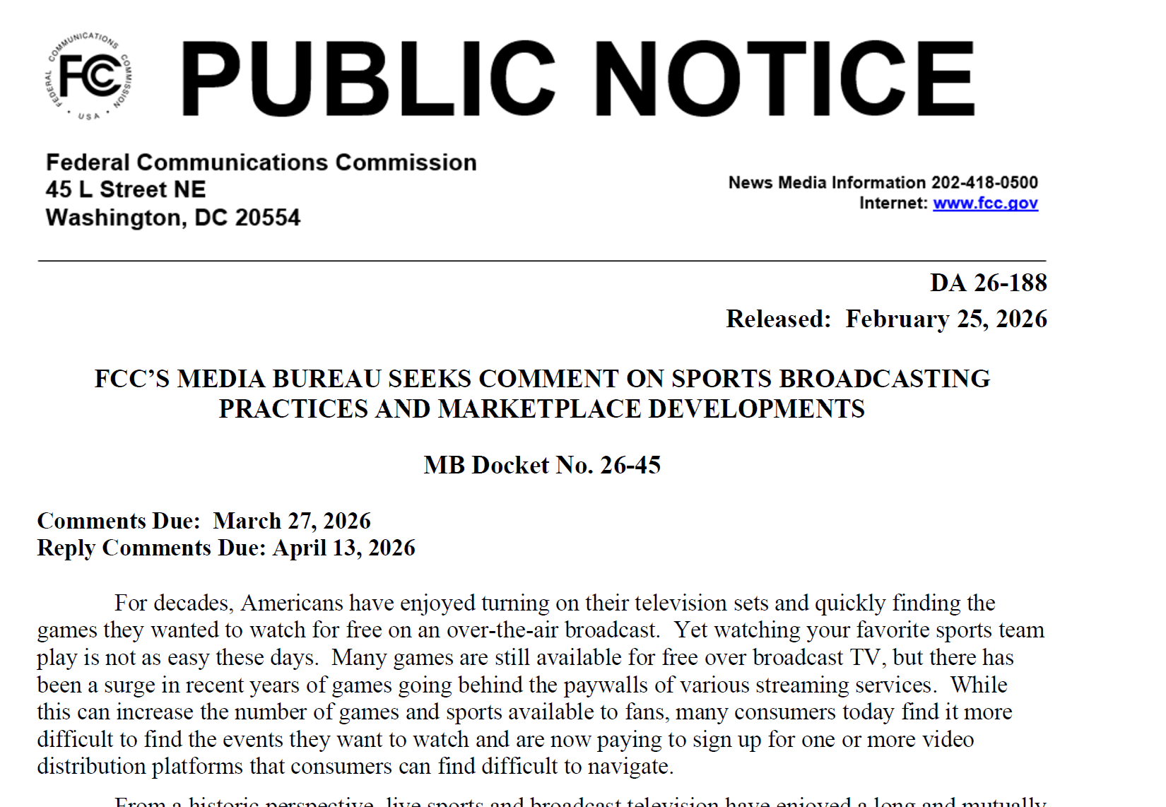 FCC 미디어국(Media Bureau)은 2026년 2월 25일 'MB Docket No. 26-45'를 통해 스포츠 방송 관행 및 시장 동향에 대한 의견 수렴 절차를 공식 개시했다. 1차 의견 마감은 3월 27일, 2차 답변 의견 마감은 4월 13일이다. FCC는 고지문에서 "수십 년간 미국인들은 TV를 켜면 무료 지상파에서 원하는 경기를 쉽게 찾을 수 있었지만, 오늘날 이는 더 이상 쉽지 않다"고 명시했다.