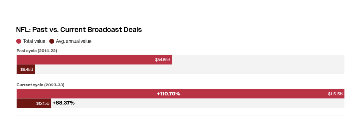 이후 60여 년 동안 NFL 미디어 권리는 미국 스포츠 시장의 절대 기준으로 부상했다. 리서치 기관과 업계 추산에 따르면, NFL이 디즈니(ESPN/ABC), 파라마운트(CBS/Paramount+), 폭스(Fox), NBC유니버설(NBC/Peacock), 아마존 프라임 비디오, 유튜브(YouTube TV·Sunday Ticket), NFL 네트워크 등과 맺은 최신 장기 패키지의 합산 가치는 2030년대 중반까지 약 1,100억 달러 수준으로, 연간으로 환산하면 100억 달러가 넘는 규모로 평가된다.