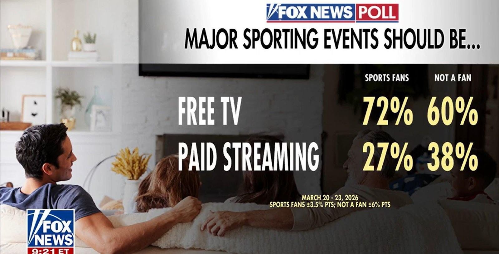 ▲ Fox News poll (March 20–23, 2026): Major sports games should be broadcast on free TV — Sports fans: 72%, Non-fans: 60%. Support for paid streaming: fans 27%, non-fans 38%. (Margin of error: fans ±3.5pp, non-fans ±6pp)