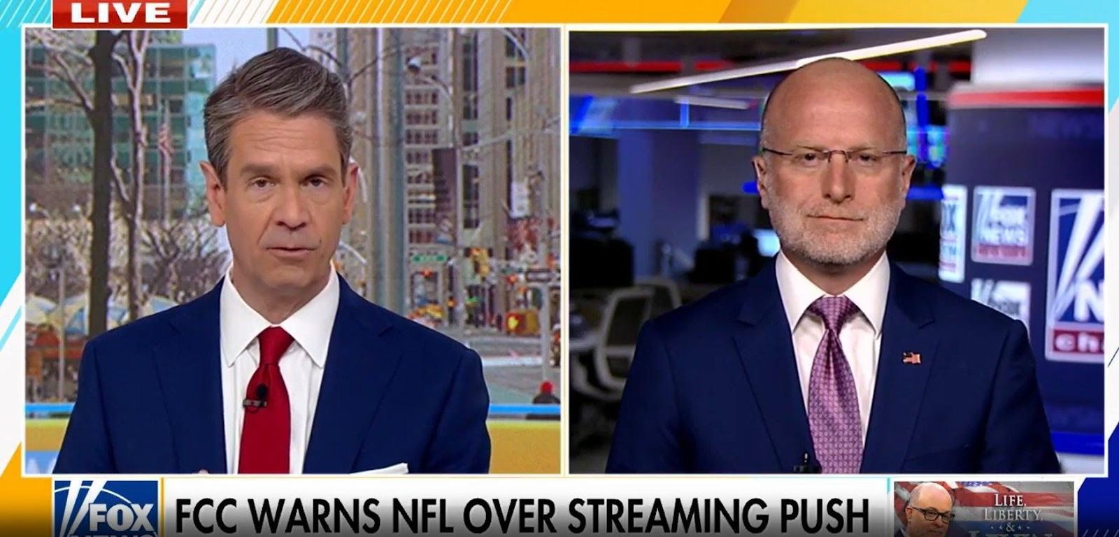 ▲ Fox News 'Fox & Friends Weekend' live broadcast. Host Griff Jenkins (left) and FCC Chairman Brendan Carr (right). Caption: "FCC WARNS NFL OVER STREAMING PUSH"
