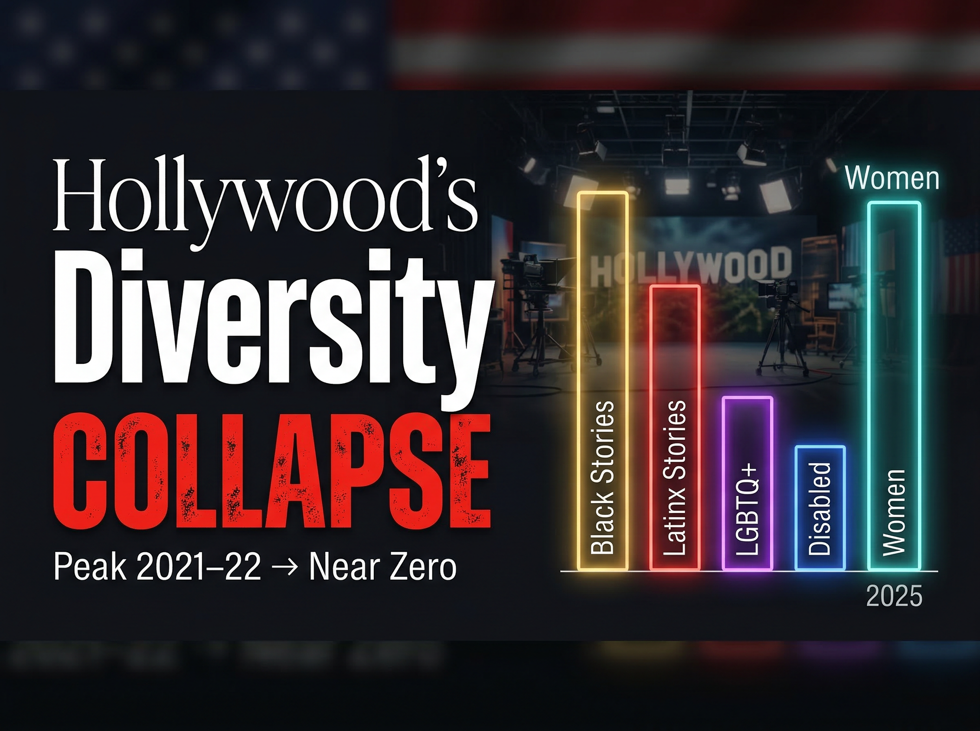 The numbers represent more than a statistical correction. They signal the effective dismantling of the DEI agenda that spread across Hollywood following George Floyd's death — an agenda that is now losing force just five years on. Luminate estimates the total number of new U.S. scripted TV titles fell 11% year-over-year in 2025, with diversity projects — perceived as higher risk — cut first.