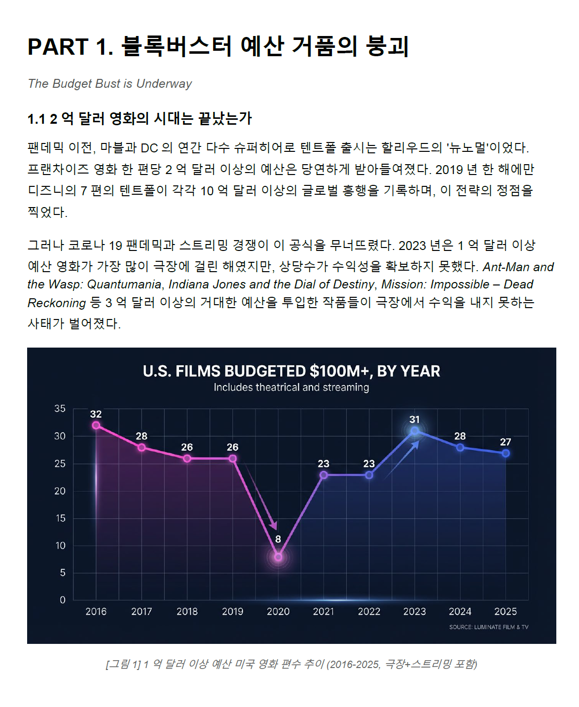 이번 분석 글은 루미네이트·Variety·Omdia 등 주요 데이터 소스를 기반으로, 2025~2026년 글로벌 영화·스트리밍·마이크로드라마 시장 변화를 정리한 산업 인사이트 보고서 형태로 구성했습니다.