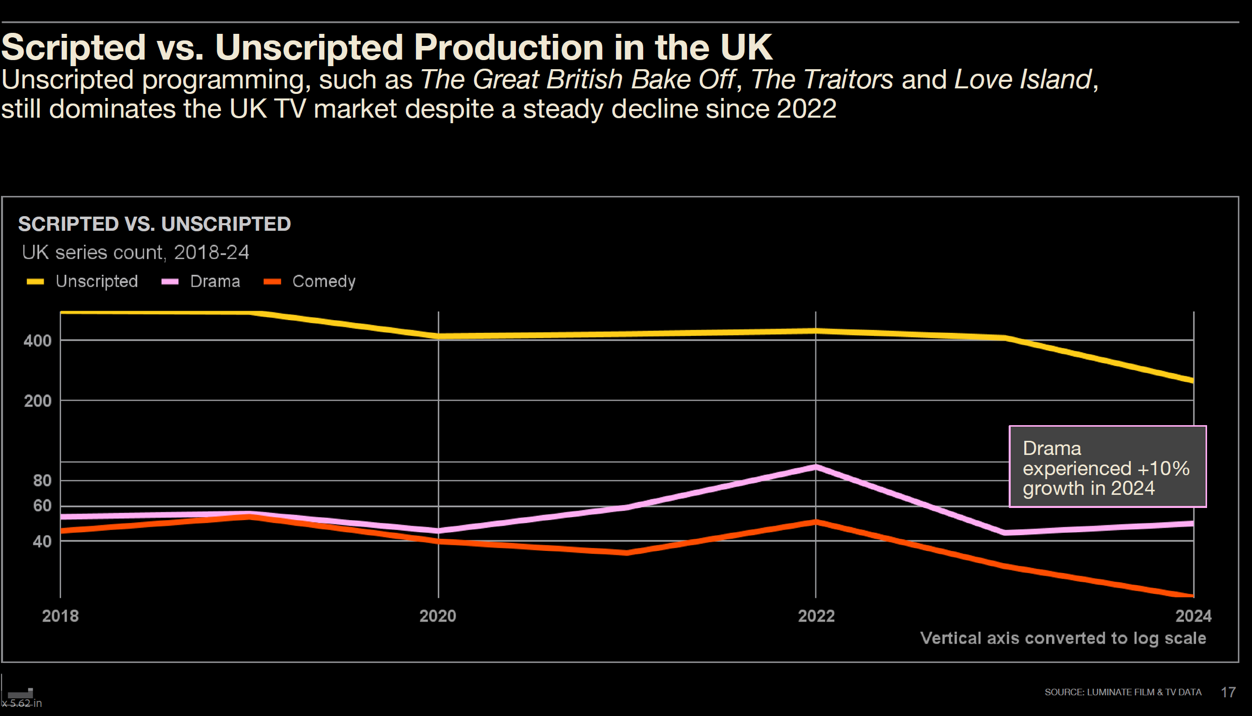 The UK remains a strong partner for U.S. production. Looking at the UK TV market itself, unscripted programs (variety and educational) still dominate but have declined since 2022. While unscripted hits like "The Traitors," "Love Island," and "The Great British Bake Off" exist, the overall trend is downward.