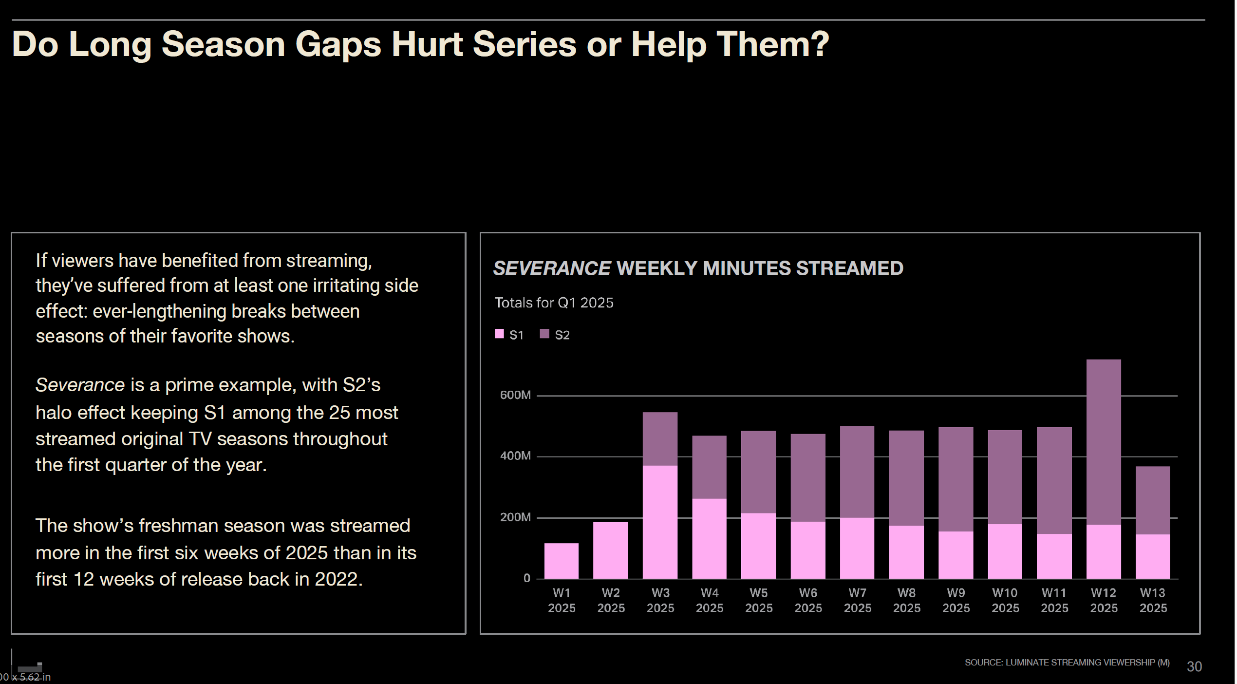 애플TV+의 '세버런스'를 보자. 시즌2는 2025년 1월 17일 개봉했고, 1위를 차지했다. 그런데 같은 주에 시즌1이 3위에 올랐다. 더 놀라운 것은 시즌1이 2025년 첫 6주 동안 2022년 첫 12주보다 더 많이 시청됐다는 사실이다. 시즌2의 후광 효과로 시즌1이 1분기 내내 상위 25위 안에 머물렀다.