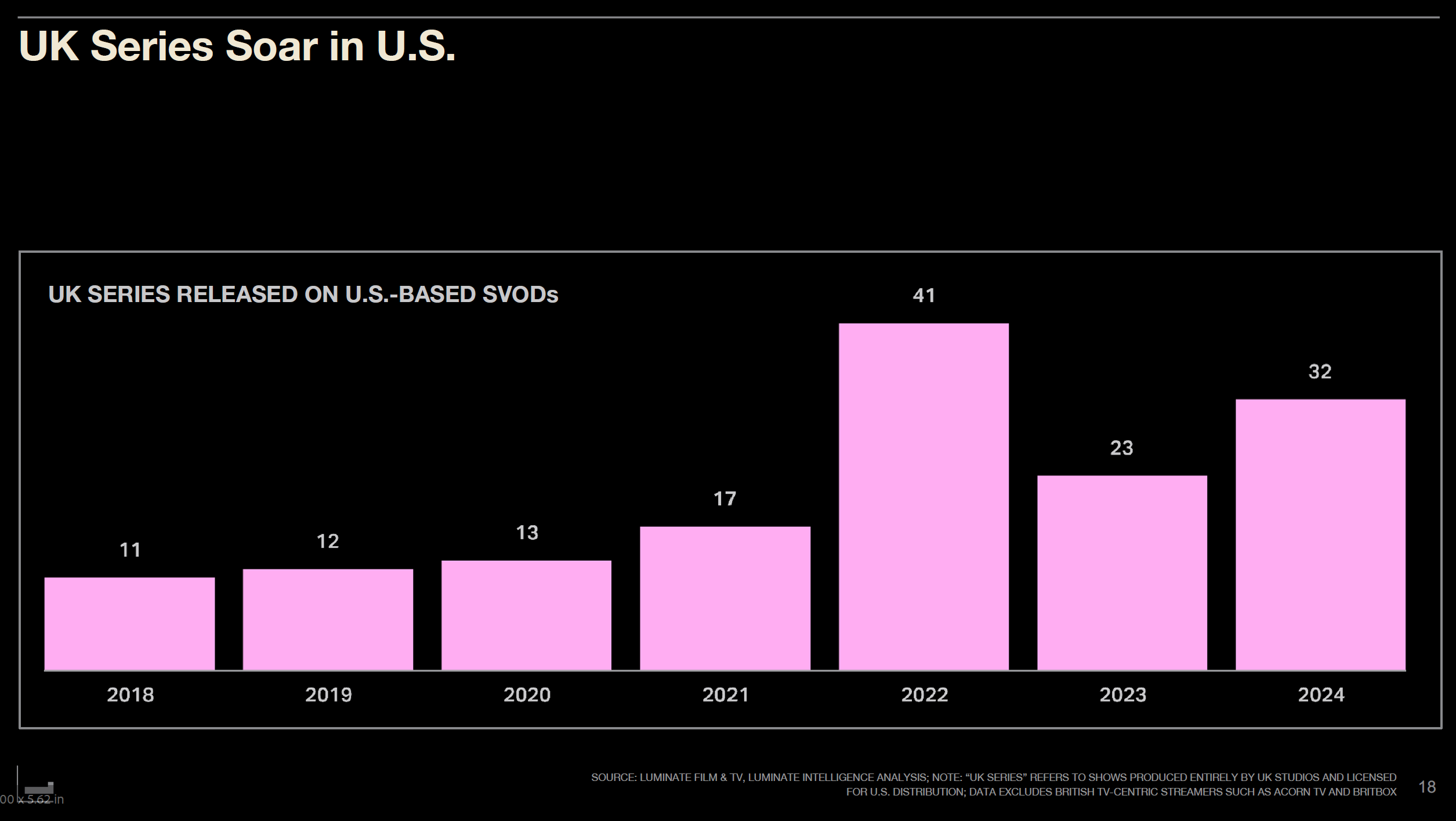 Korea wasn't alone in its rise. British series also achieved remarkable success in the U.S. market. UK series on U.S. SVOD platforms grew from just 11 in 2018 to a peak of 41 in 2022, maintaining 32 titles in 2024.