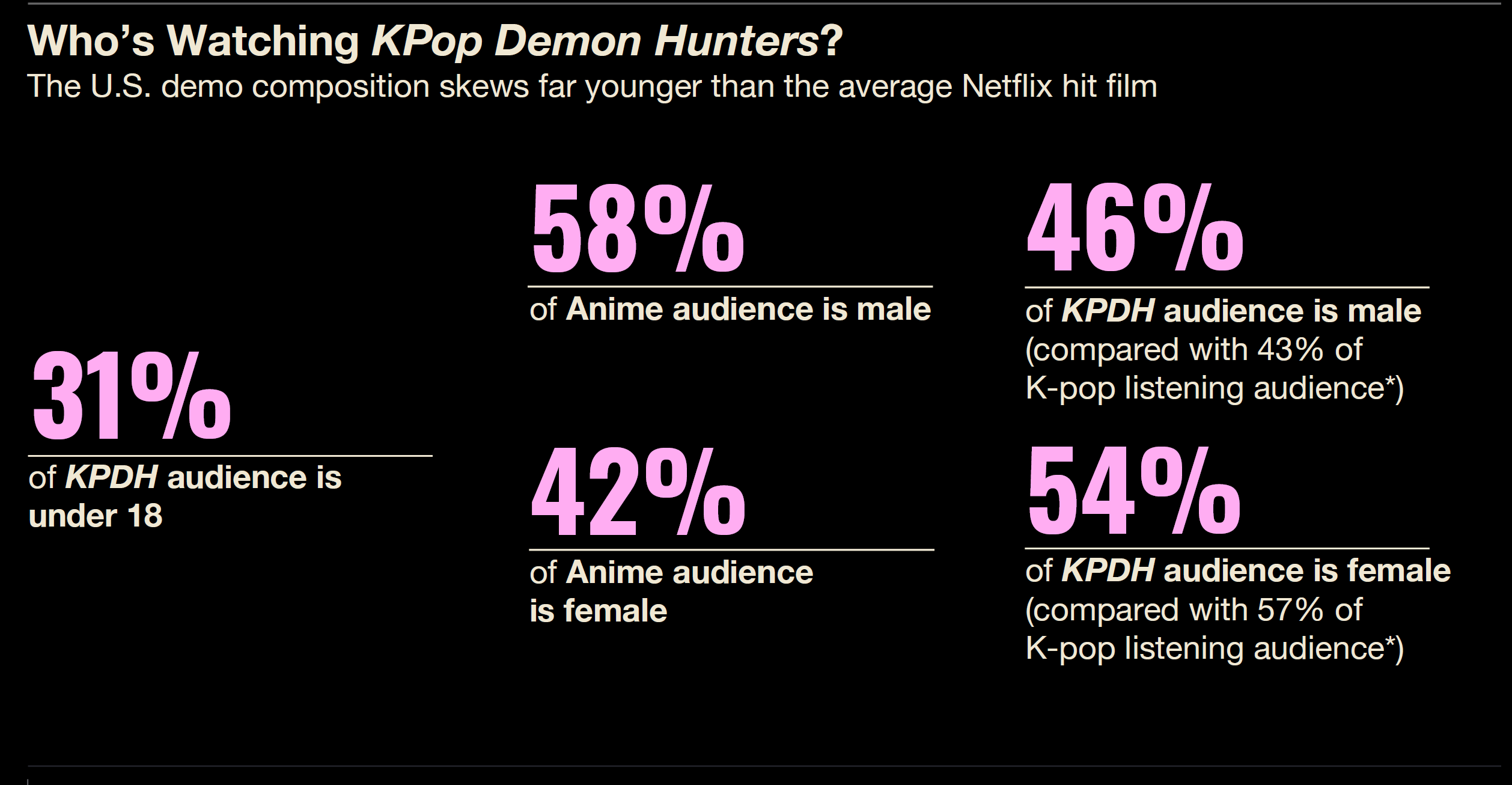 Audience analysis is also interesting. 31% of viewers were under 18, much younger than average Netflix films. While animated TV programs typically skew 58% male and K-pop listening 57% female, "K-Pop Demon Slayers" was nearly equal at 54% female, 46% male—a perfect blend of K-pop and animation demographics.