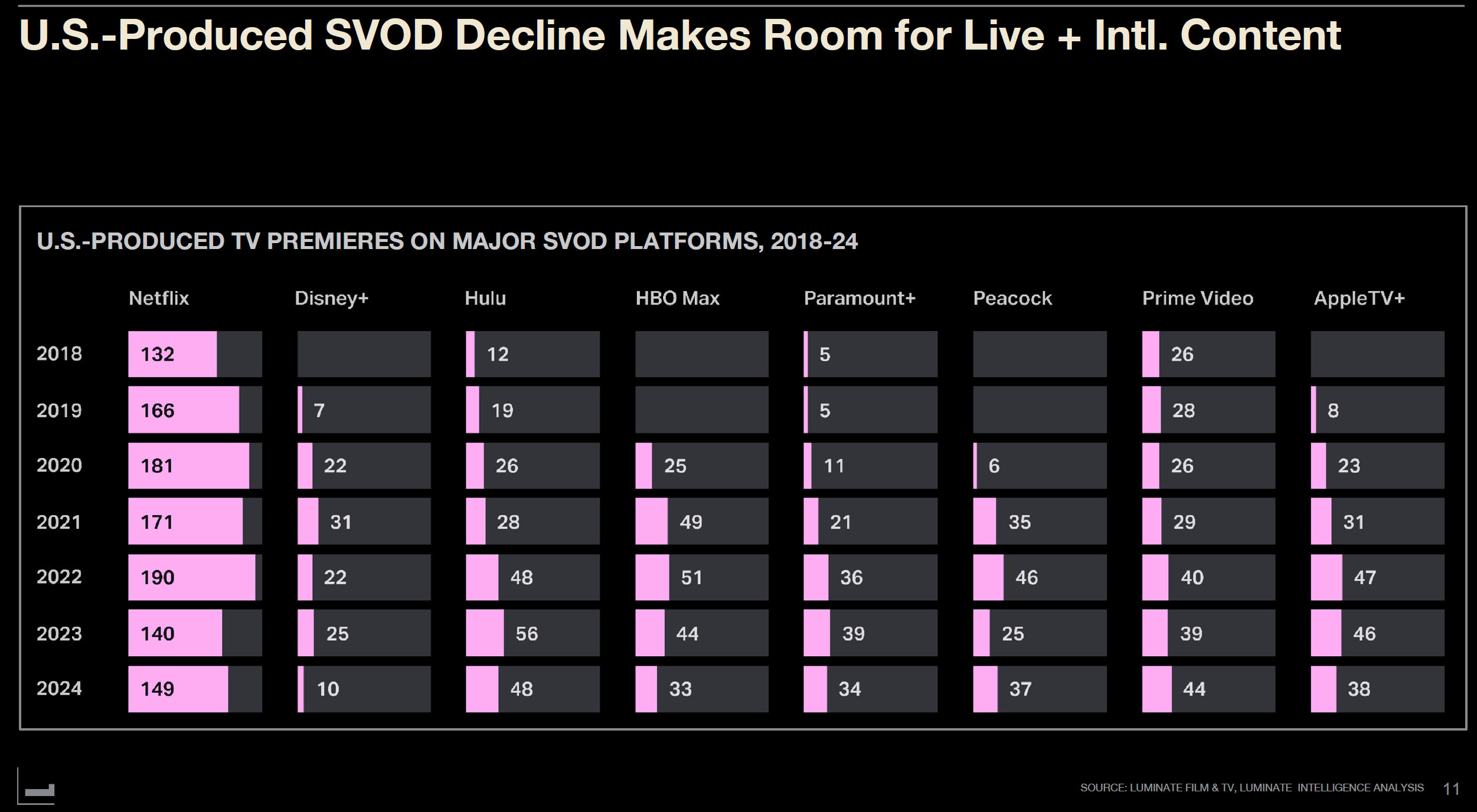 By platform, Netflix showed the largest drop from 190 titles in 2022 to 149 in 2024, yet remains the overwhelmingly dominant producer. New streamer entries like Disney+, HBO Max, and Peacock had a clear impact in 2020, while 2023 reflected strike impacts across all platforms. M&A volatility is expected in 2025.