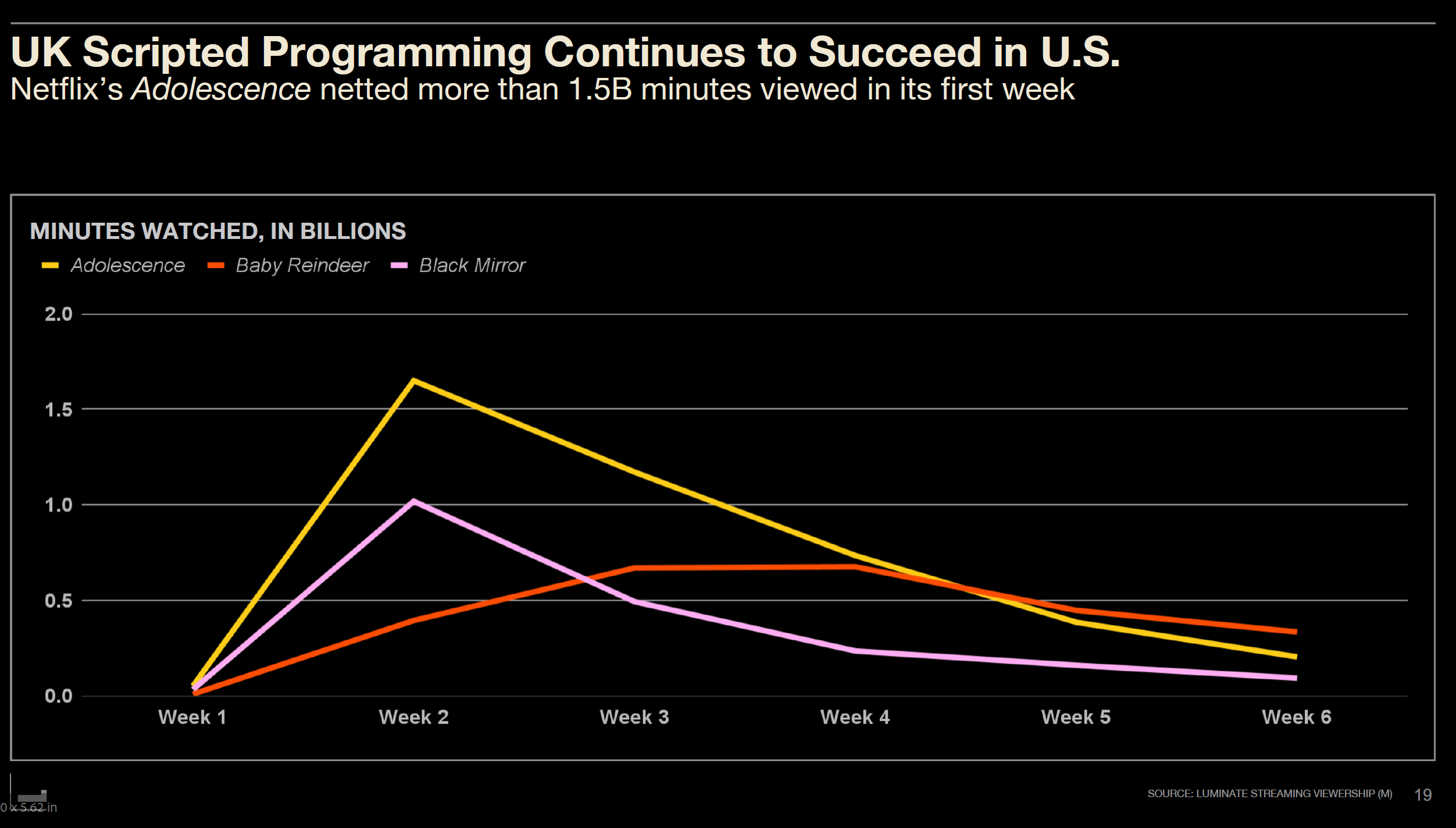 Netflix's "Adolescence" was viewed over 1.5 billion minutes in the U.S. alone in its first week, reaching #1 in 71 countries. "Baby Reindeer" and "Black Mirror" each garnered over 1 billion minutes of viewing in their first six weeks, demonstrating UK content's strength.