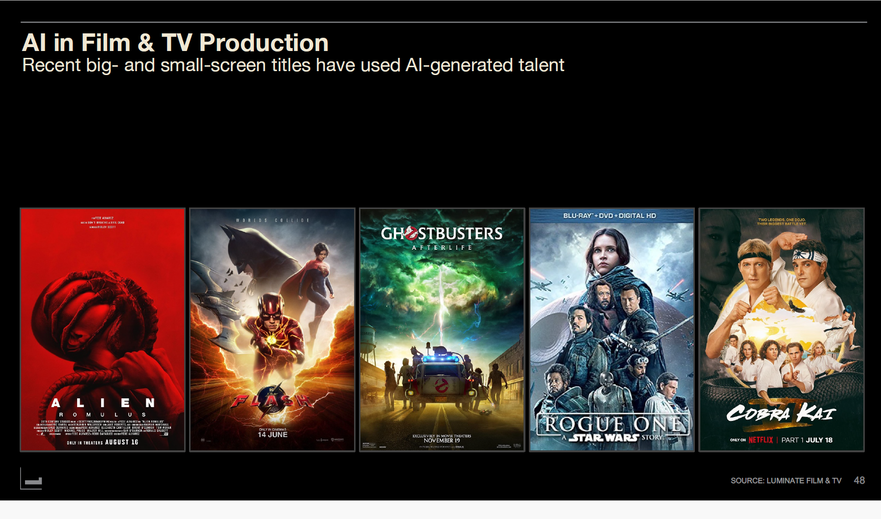 Luminate hasn't yet seen official AI-produced projects publicly announced within major U.S. distributors but expects them soon. AI is already playing a transformative role in film and TV production, particularly in talent and special effects.
