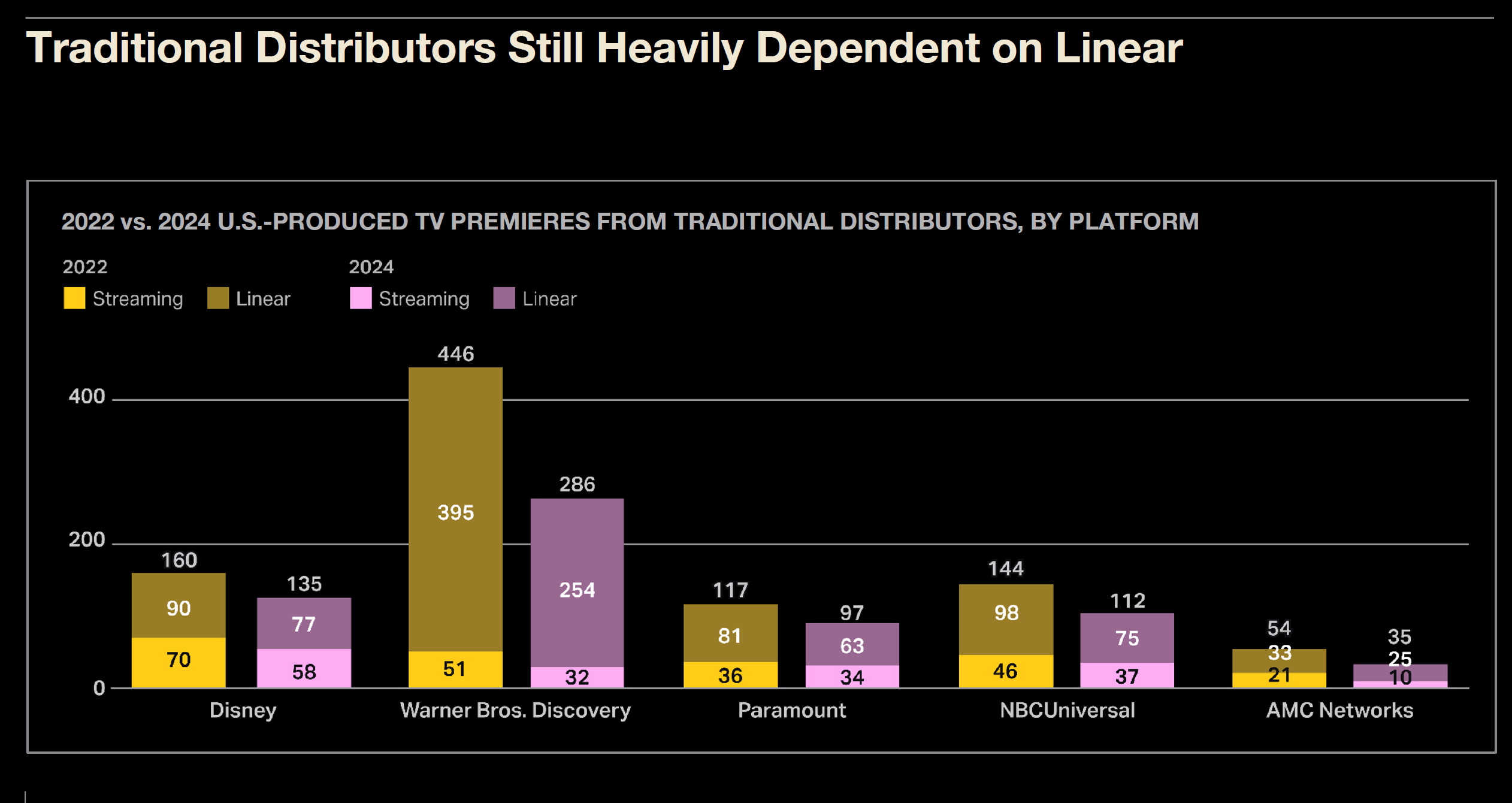 Traditional distributors still maintain high exposure to broadcast and cable. Comparing 2022 and 2024, Warner Bros. Discovery produced 395 of 841 titles for broadcast/cable, while Paramount made 117 of 214 for linear platforms, showing these companies' ongoing transition from legacy businesses to streaming.