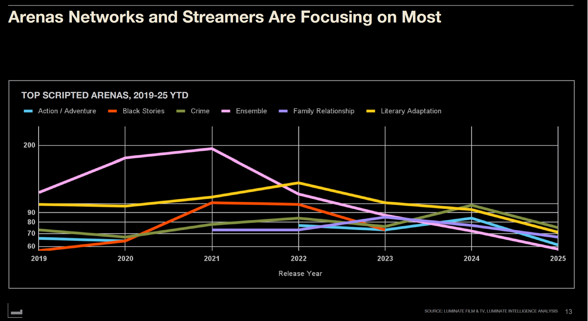 장르별로는 범죄물(트루 크라임 포함)이 2025년 1위 아레나로 부상했다. 넷플릭스의 '몬스터: 라일과 에릭 메넨데즈 이야기' 같은 작품이 대표적이다. 2위는 문학 각색으로, 20세기 텔레비전의 '윌 트렌트'와 넷플릭스의 '헌팅 와이브스' 등이 포함된다. 3위는 가족 관계 드라마로, HBO맥스의 '더 길디드 에이지' 같은 작품이 2024년 액션·어드벤처를 제치고 올라섰다.
