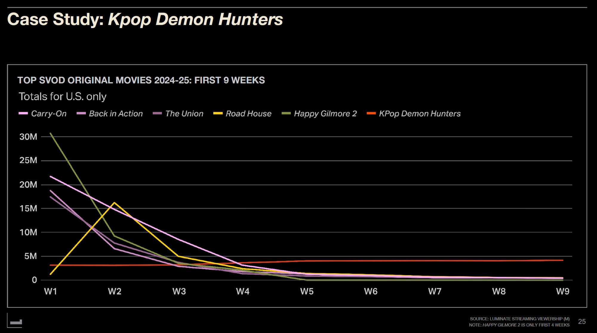 The third example is the remarkable success story of "K-Pop Demon Slayers." This Netflix animated film received a lukewarm first-week response, lingering at the bottom of charts while other original films like "Carry-On," "Back in Action," "The Union," "Road House," and "Happy Gilmore 2" showed typical spike-and-drop patterns.