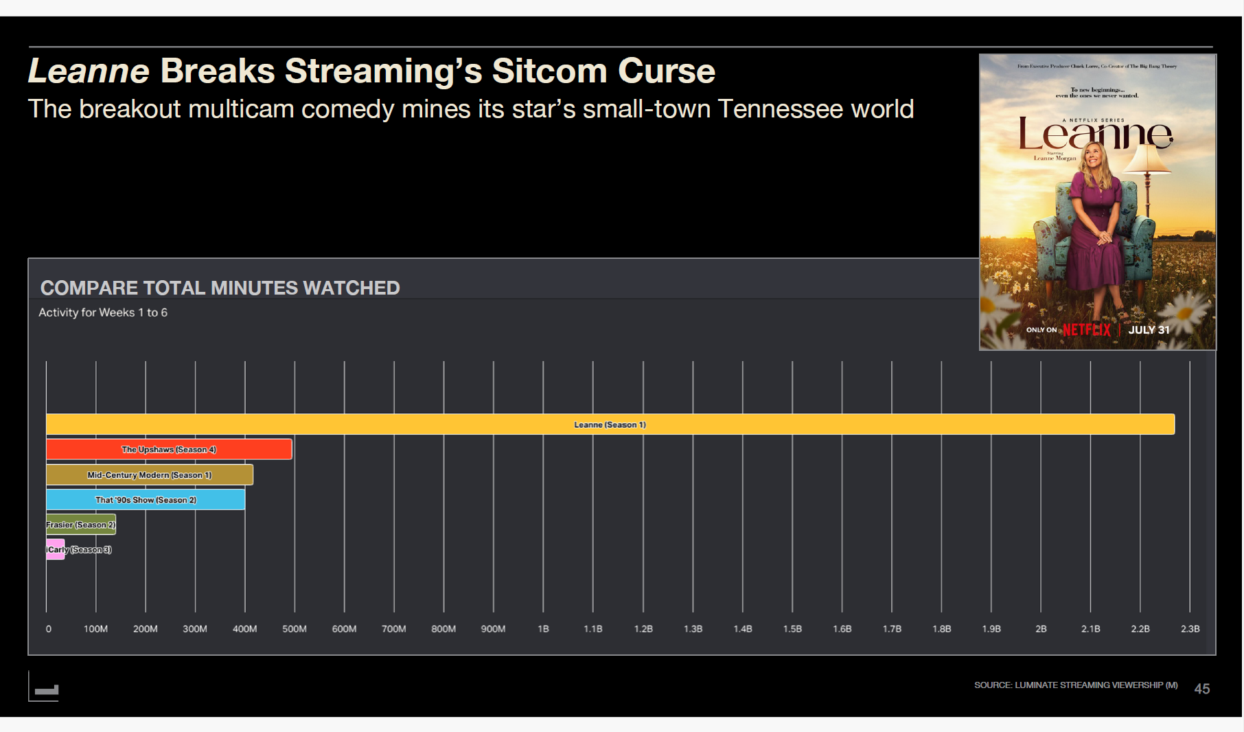 The most interesting case is Netflix's multi-camera comedy "Leanne." For years, neither Netflix nor other streaming platforms produced new sitcom hits, but "Leanne" broke this curse.