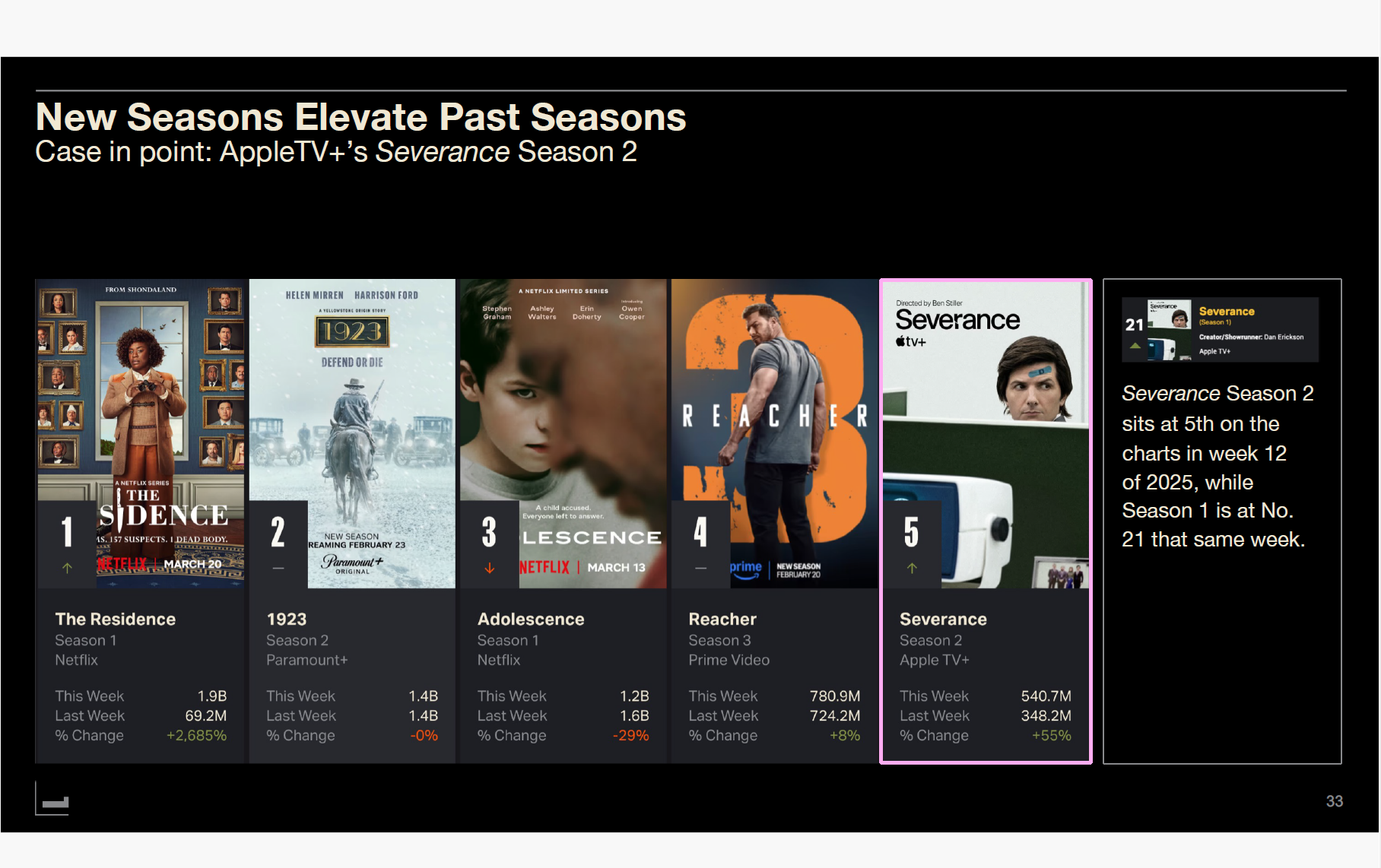 Consider Apple TV+'s "Severance." Season 2 premiered January 17, 2025, reaching #1. That same week, Season 1 reached #3. More surprisingly, Season 1 was viewed more in the first six weeks of 2025 than in its original first 12 weeks in 2022. The Season 2 halo effect kept Season 1 in the Top 25 throughout Q1.