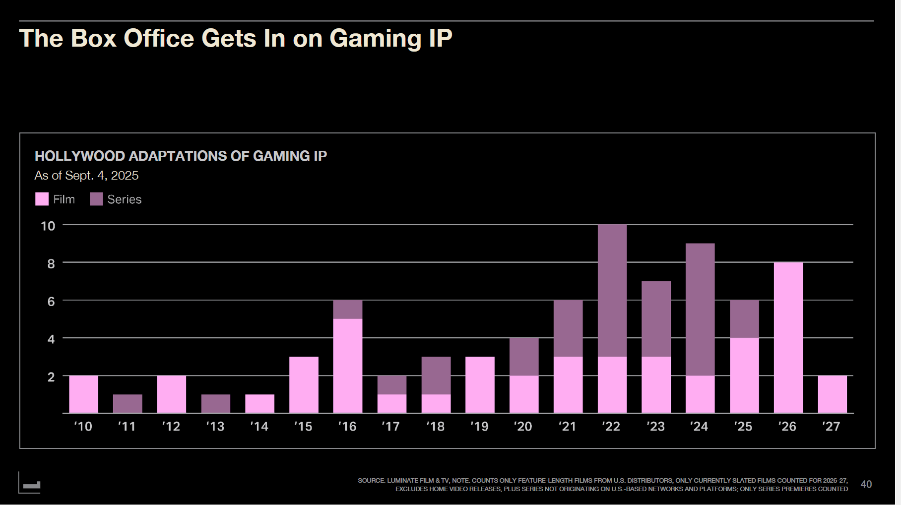 Looking at Hollywood's gaming IP adaptations since 2010, they surged from 2016–2022. 2022 peaked with 10 TV series premiering. 2025 will be the first year since 2021 with more theatrical gaming adaptations than TV, showing a strategic shift prioritizing easier revenue from existing IP at the box office.