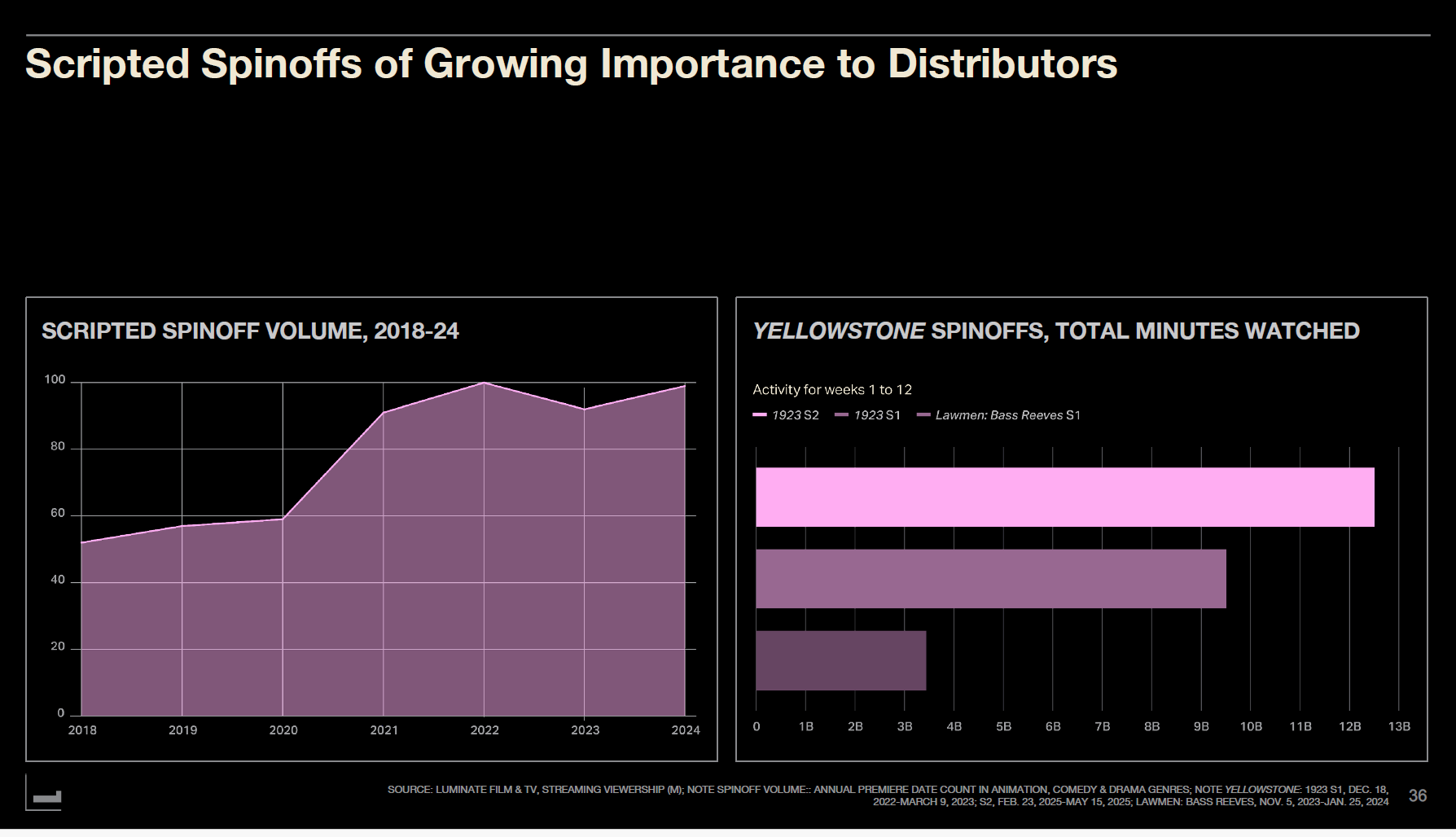 스크립티드 스핀오프 시리즈(드라마 외전, 스핀오프)는 2018~2025년 사이 75% 증가했다. 2018년 52편에서 2024년 99편으로 거의 두 배가 됐다. 이 트렌드는 사라지지 않을 것이다. 현재 미국 SVOD에서 기존 TV 및 영화 IP를 기반으로 한 56편의 추가 시리즈가 개발 중이다.